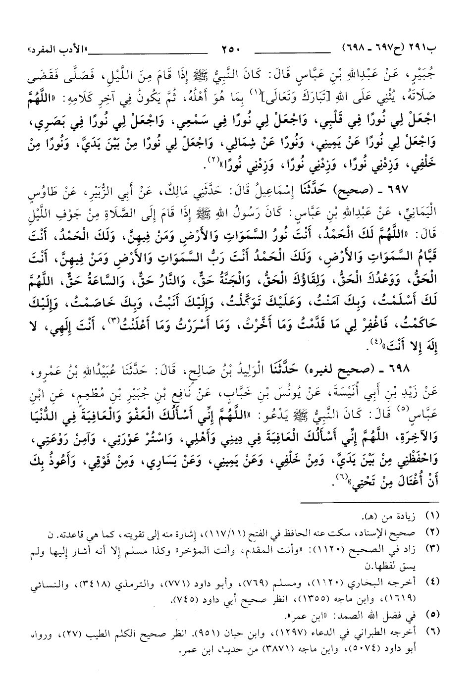 697 - حَدَّثَنَا إِسْمَاعِيلُ, قَالَ: حَدَّثَنِي مَالِكٌ، عَنْ أَبِي الزُّبَيْرِ، عَنْ طَاوُسٍ الْيَمَانِيِّ، عَنْ عَبْدِ اللهِ بْنِ عَبَّاسٍ: كَانَ رَسُولُ اللهِ صَلَّى اللهُ عَلَيهِ وَسَلَّمَ إِذَا قَامَ إِلَى الصَّلاَةِ مِنْ جَوْفِ اللَّيْلِ قَالَ: اللَّهُمَّ لَكَ الْحَمْدُ، أَنْتَ نُورُ السَّمَاوَاتِ وَالأَرْضِ وَمَنْ فِيهِنَّ، وَلَكَ الْحَمْدُ، أَنْتَ قَيَّامُ السَّمَاوَاتِ وَالأَرْضِ، وَلَكَ الْحَمْدُ أَنْتَ رَبُّ السَّمَاوَاتِ وَالأَرْضِ وَمَنْ فِيهِنَّ، أَنْتَ الْحَقُّ، وَوَعْدُكَ الْحَقُّ، وَلِقَاؤُكَ الْحَقُّ، وَالْجَنَّةُ حَقٌّ، وَالنَّارُ حَقٌّ، وَالسَّاعَةُ حَقٌّ، اللَّهُمَّ لَكَ أَسْلَمْتُ، وَبِكَ آمَنْتُ، وَعَلَيْكَ تَوَكَّلْتُ، وَإِلَيْكَ أَنَبْتُ، وَبِكَ خَاصَمْتُ، وَإِلَيْكَ حَاكَمْتُ، فَاغْفِرْ لِي مَا قَدَّمْتُ وَأَخَّرْتُ، وَما أَسْرَرْتُ وَما أَعْلَنْتُ، أَنْتَ إِلَهِي، لا إِلَهَ إِلا أَنْتَ.