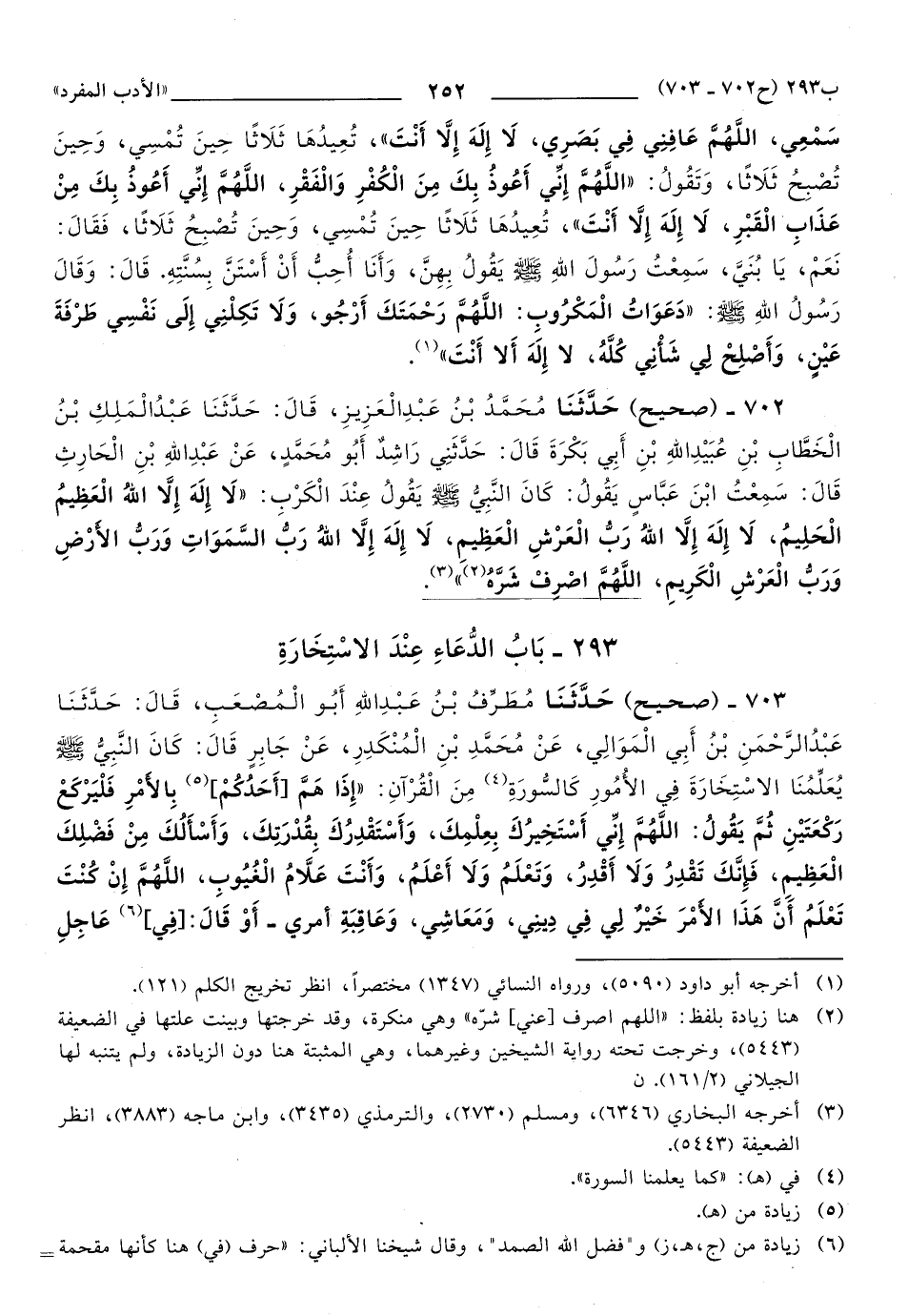 703 - حَدَّثَنَا مُطَرِّفُ بْنُ عَبْدِ اللهِ, أَبُو الْمُصْعَبِ، قَالَ: حَدَّثَنَا عَبْدُ الرَّحْمَنِ بْنُ أَبِي الْمَوَالِي، عَنْ مُحَمَّدِ بْنِ الْمُنْكَدِرِ، عَنْ جَابِرٍ, قَالَ: كَانَ النَّبِيُّ صَلَّى اللهُ عَلَيهِ وَسَلَّمَ يُعَلِّمُنَا الاسْتِخَارَةَ فِي الأُمُورِ كَالسُّورَةِ مِنَ الْقُرْآنِ: إِذَا هَمَّ أَحَدُكُمْ بِالأَمْرِ فَلْيَرْكَعْ رَكْعَتَيْنِ, ثُمَّ يَقُولُ: اللَّهُمَّ إِنِّي أَسْتَخِيرُكَ بِعِلْمِكَ، وَأَسْتَقْدِرُكَ بِقُدْرَتِكَ، وَأَسْأَلُكَ مِنْ فَضْلِكَ الْعَظِيمِ، فَإِنَّكَ تَقْدِرُ وَلاَ أَقْدِرُ، وَتَعْلَمُ وَلاَ أَعْلَمُ، وَأَنْتَ عَلاَّمُ الْغُيُوبِ، اللَّهُمَّ إِنْ كُنْتَ تَعْلَمُ أَنَّ هَذَا الأَمْرَ خَيْرٌ لِي فِي دِينِي، وَمَعَاشِي، وَعَاقِبَةِ أمري، -أَوْ قَالَ: فِي عَاجِلِ أَمْرِي- وَآجِلِهِ، فَأَقْدِرْهُ لِي، وَإِنْ كُنْتَ تَعْلَمُ أَنَّ هَذَا الأَمْرَ شَرٌّ لِي فِي دِينِي، وَمَعَاشِي، وَعَاقِبَةِ (1)، -أَوْ قَالَ: عَاجِلِ أَمْرِي- وَآجِلِهِ, فَاصْرِفْهُ عَنِّي وَاصْرِفْنِي عَنْهُ، وَاقْدُرْ لِيَ الْخَيْرَ حَيْثُ كَانَ، ثُمَّ رَضِّنِي، وَيُسَمِّي حَاجَتَهُ.