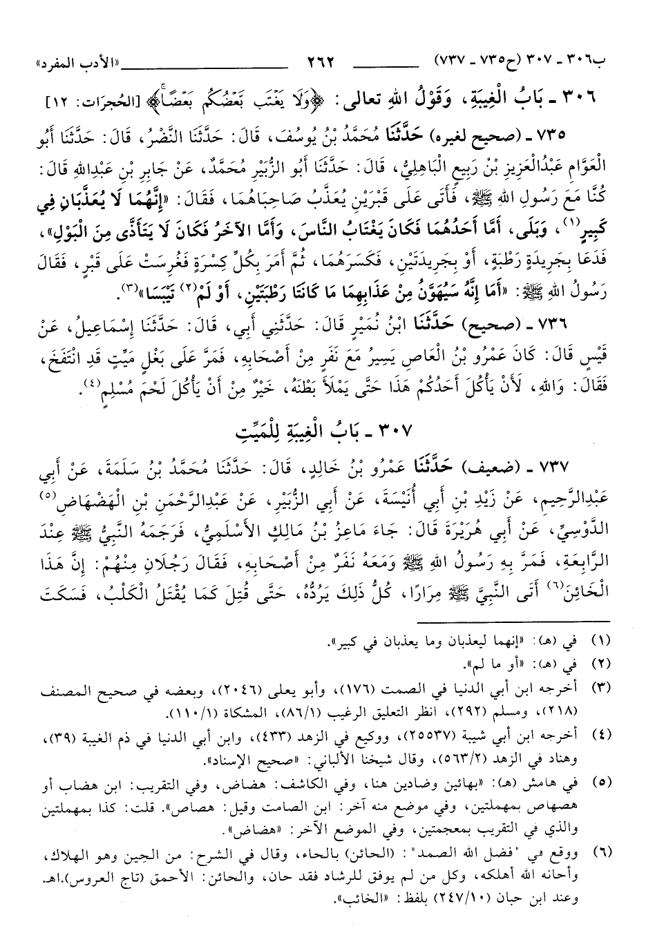 306 - بَابُ الْغِيبَةِ، وَقَوْلُ اللهِ تَعَالَى: {وَلاَ يَغْتَبْ بَعْضُكُمْ بَعْضًا}