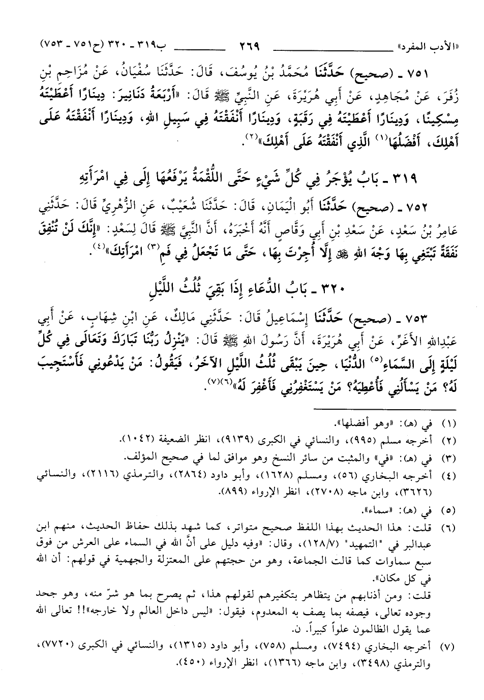 751 - حَدَّثَنَا مُحَمَّدُ بْنُ يُوسُفَ، قَالَ: حَدَّثَنَا سُفْيَانُ، عَنْ مُزَاحِمِ بْنِ زُفَرَ، عَنْ مُجَاهِدٍ، عَنْ أَبِي هُرَيْرَةَ، عَنِ النَّبِيِّ صَلَّى اللهُ عَلَيهِ وَسَلَّمَ قَالَ: أَرْبَعَةُ دَنَانِيرَ: دِينَارًا أَعْطَيْتَهُ مِسْكِينًا، وَدِينَارًا أَعْطَيْتَهُ فِي رَقَبَةٍ، وَدِينَارًا أَنْفَقْتَهُ فِي سَبِيلِ اللهِ، وَدِينَارًا أَنْفَقْتَهُ عَلَى أَهْلِكَ، أَفْضَلُهَا الَّذِي أَنْفَقْتَهُ عَلَى أَهْلِكَ.
