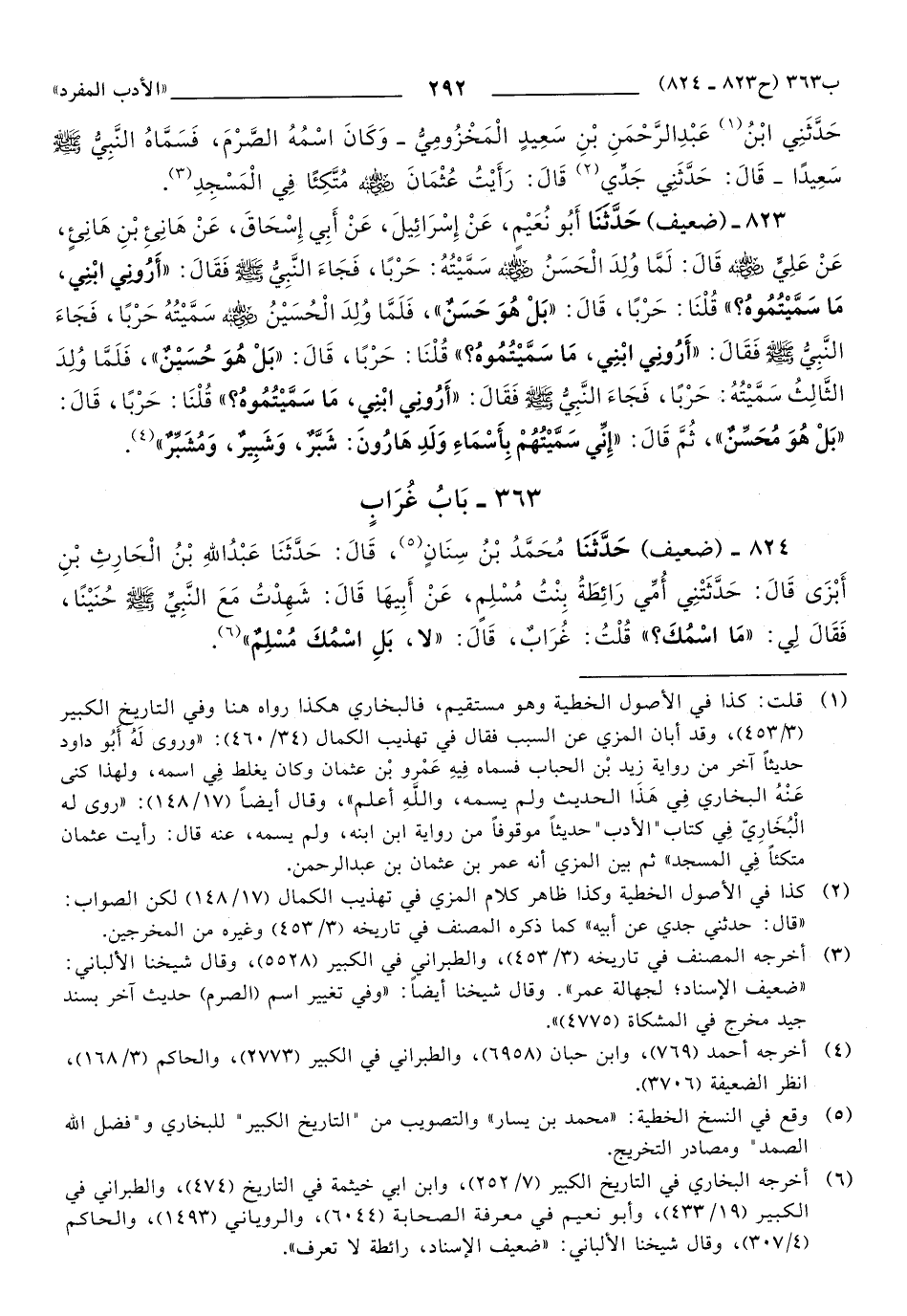 823 - حَدَّثَنَا أَبُو نُعَيْمٍ، عَنْ إِسْرَائِيلَ، عَنْ أَبِي إِسْحَاقَ، عَنْ هَانِئِ بْنِ هَانِئٍ، عَنْ عَلِيٍّ رَضِيَ اللهُ عَنْهُ, قَالَ: لَمَّا وُلِدَ الْحَسَنُ رَضِيَ اللهُ عَنْهُ سَمَّيْتُهُ: حَرْبًا، فَجَاءَ النَّبِيُّ صَلَّى اللهُ عَلَيهِ وَسَلَّمَ فَقَالَ: أَرُونِي ابْنِي، مَا سَمَّيْتُمُوهُ؟ قُلْنَا: حَرْبًا، قَالَ: بَلْ هُوَ حَسَنٌ، فَلَمَّا وُلِدَ الْحُسَيْنُ رَضِيَ اللهُ عَنْهُ سَمَّيْتُهُ حَرْبًا، فَجَاءَ النَّبِيُّ صَلَّى اللهُ عَلَيهِ وَسَلَّمَ فَقَالَ: أَرُونِي ابْنِي، مَا سَمَّيْتُمُوهُ؟ قُلْنَا: حَرْبًا، قَالَ: بَلْ هُوَ حُسَيْنٌ، فَلَمَّا وُلِدَ الثَّالِثُ سَمَّيْتُهُ: حَرْبًا، فَجَاءَ النَّبِيُّ صَلَّى اللهُ عَلَيهِ وَسَلَّمَ فَقَالَ: أَرُونِي ابْنِي، مَا سَمَّيْتُمُوهُ؟ قُلْنَا: حَرْبًا، قَالَ: بَلْ هُوَ مُحْسِنٌ، ثُمَّ قَالَ: إِنِّي سَمَّيْتُهُمْ بِأَسْمَاءِ وَلَدِ هَارُونَ: شَبْرٌ، وَشُبَيرٌ، وَمُشَبِّرٌ.