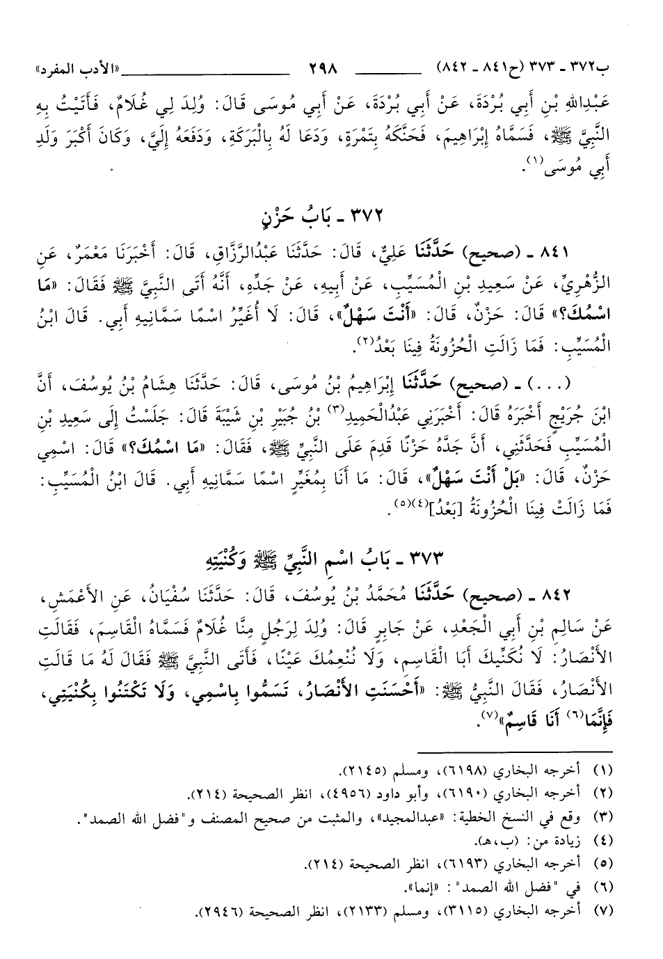 842 - حَدَّثَنَا مُحَمَّدُ بْنُ يُوسُفَ، قَالَ: حَدَّثَنَا سُفْيَانُ، عَنِ الأَعْمَشِ، عَنْ سَالِمِ بْنِ أَبِي الْجَعْدِ، عَنْ جَابِرٍ, قَالَ: وُلِدَ لِرَجُلٍ مِنَّا غُلاَمٌ, فَسَمَّاهُ الْقَاسِمَ، فَقَالَتِ الأَنْصَارُ: لاَ نُكَنِّيكَ أَبَا الْقَاسِمِ، وَلاَ نُنْعِمُكَ عَيْنًا، فَأَتَى النَّبِيَّ صَلَّى اللهُ عَلَيهِ وَسَلَّمَ فَقَالَ لَهُ مَا قَالَتِ الأَنْصَارُ، فَقَالَ النَّبِيُّ صَلَّى اللهُ عَلَيهِ وَسَلَّمَ: أَحْسَنَتِ الأَنْصَارُ، تَسَمُّوا بِاسْمِي، وَلاَ تَكَتنُّوا (1) بِكُنْيَتِي، فَإِنَّمَا أَنَا قَاسِمٌ.