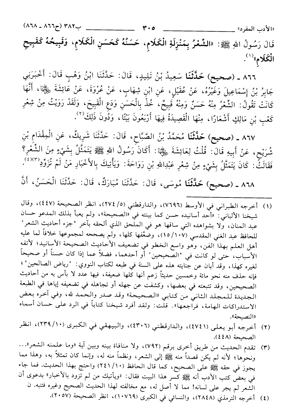 866 - حَدَّثَنَا سَعِيدُ بْنُ تَلِيدٍ، قَالَ: حَدَّثَنَا ابْنُ وَهْبٍ, قَالَ: أَخْبَرَنِي جَابِرُ بْنُ إِسْمَاعِيلَ، وَغَيْرُهُ، عَنْ عُقَيْلٍ، عَنِ ابْنِ شِهَابٍ، عَنْ عُرْوَةَ، عَنْ عَائِشَةَ رَضِيَ اللهُ عَنْهَا، أَنَّهَا كَانَتْ تَقُولُ: الشِّعْرُ مِنْهُ حَسَنٌ وَمِنْهُ قَبِيحٌ، خُذْ بِالْحَسَنِ وَدَعِ الْقَبِيحَ، وَلَقَدْ رَوَيْتُ مِنْ شِعْرِ كَعْبِ بْنِ مَالِكٍ أَشْعَارًا، مِنْهَا الْقَصِيدَةُ فِيهَا أَرْبَعُونَ بَيْتًا، وَدُونَ ذَلِكَ.
