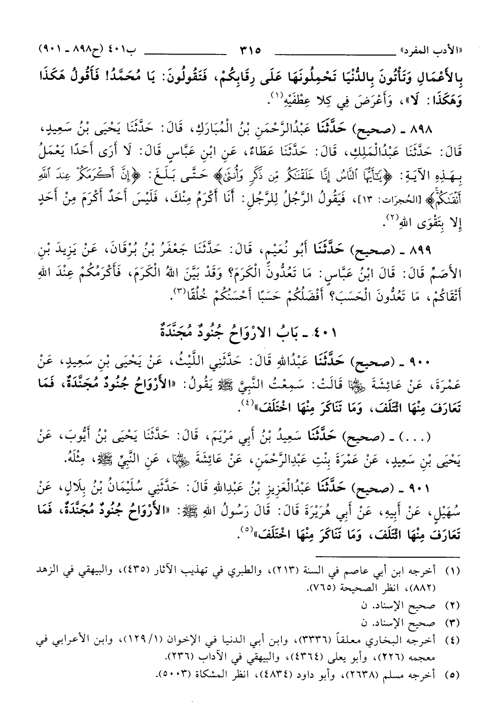 901 - حَدَّثَنَا عَبْدُ الْعَزِيزِ بْنُ عَبْدِ اللهِ, قَالَ: حَدَّثَنَا سُلَيْمَانُ بْنُ بِلاَلٍ، عَنْ سُهَيْلٍ، عَنْ أَبِيهِ، عَنْ أَبِي هُرَيْرَةَ, قَالَ: قَالَ رَسُولُ اللهِ صَلَّى اللهُ عَلَيهِ وَسَلَّمَ: الأَرْوَاحُ جُنُودٌ مُجَنَّدَةٌ، فَمَا تَعَارَفَ مِنْهَا ائْتَلَفَ، وَمَا تَنَاكَرَ مِنْهَا اخْتَلَفَ.