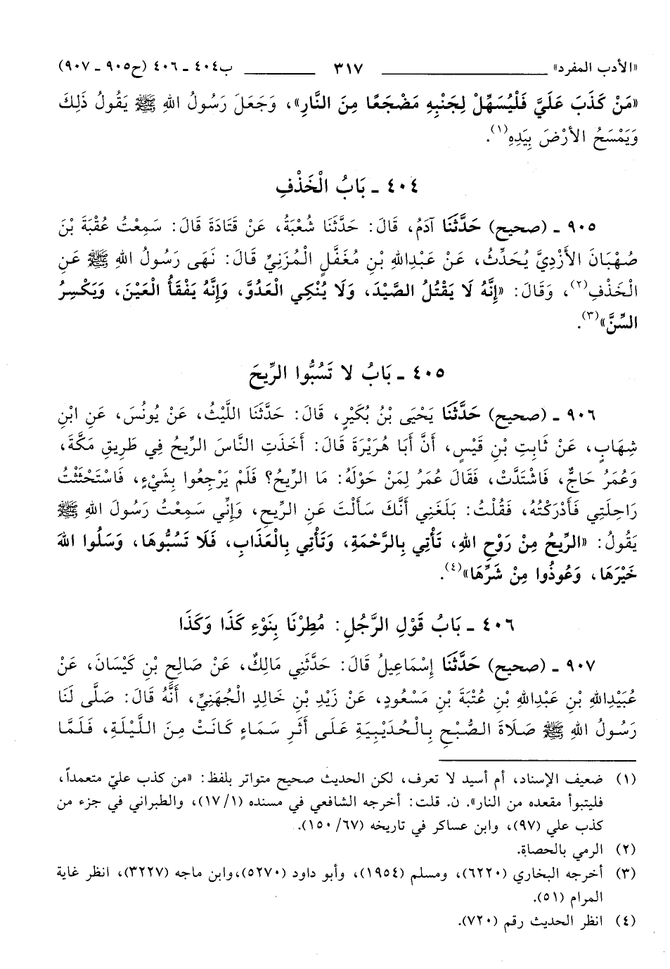 905 - حَدَّثَنَا آدَمُ، قَالَ: حَدَّثَنَا شُعْبَةُ، عَنْ قَتَادَةَ, قَالَ: سَمِعْتُ عُقْبَةَ بْنَ صُهْبَانَ الأَزْدِيَّ يُحَدِّثُ، عَنْ عَبْدِ اللهِ بْنِ مُغَفَّلٍ الْمُزَنِيِّ, قَالَ: نَهَى رَسُولُ اللهِ صَلَّى اللهُ عَلَيهِ وَسَلَّمَ عَنِ الْخَذْفِ، وَقَالَ: إِنَّهُ لاَ يَقْتُلُ الصَّيْدَ، وَلاَ يُنْكِي الْعَدُوَّ، وَإِنَّهُ يَفْقَأُ الْعَيْنَ، وَيَكْسِرُ السِّنَّ.