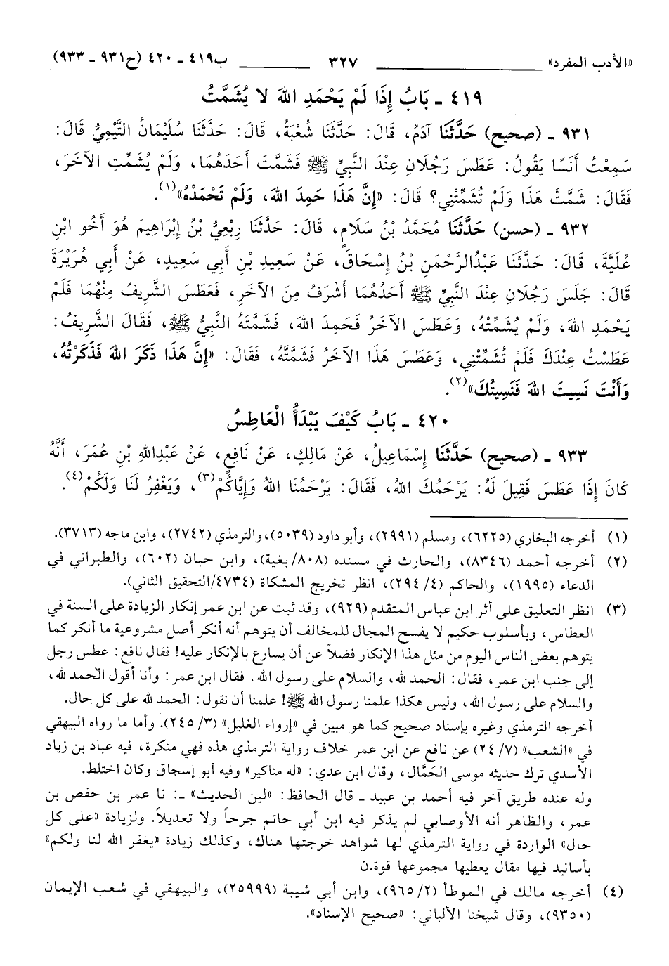 931 - حَدَّثَنَا آدَمُ، قَالَ: حَدَّثَنَا شُعْبَةُ، قَالَ: حَدَّثَنَا سُلَيْمَانُ التَّيْمِيُّ, قَالَ: سَمِعْتُ أَنَسًا يَقُولُ: عَطَسَ رَجُلاَنِ عِنْدَ النَّبِيِّ صَلَّى اللهُ عَلَيهِ وَسَلَّمَ فَشَمَّتَ أَحَدَهُمَا، وَلَمْ يُشَمِّتِ الآخَرَ، فَقَالَ: شَمَّتَّ هَذَا وَلَمْ تُشَمِّتْنِي؟ قَالَ: إِنَّ هَذَا حَمِدَ اللهَ، وَلَمْ تَحْمَدْهُ.