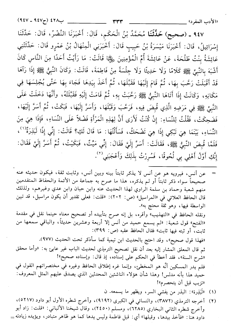 947 - حَدَّثَنَا مُحَمَّدُ بْنُ الْحَكَمِ، قَالَ: أَخْبَرَنَا النَّضْرُ، قَالَ: حَدَّثَنَا إِسْرَائِيلُ، قَالَ: أَخْبَرَنَا مَيْسَرَةُ بْنُ حَبِيبٍ, قَالَ: أَخْبَرَنِي الْمِنْهَالُ بْنُ عَمْرٍو, قَالَ: حَدَّثَتْنِي عَائِشَةُ بِنْتُ طَلْحَةَ، عَنْ عَائِشَةَ أُمِّ الْمُؤْمِنِينَ رَضِيَ اللهُ عَنْهَا قَالَتْ: مَا رَأَيْتُ أَحَدًا مِنَ النَّاسِ كَانَ أَشْبَهَ بِالنَّبِيِّ صَلَّى اللهُ عَلَيهِ وَسَلَّمَ كَلاَمًا وَلاَ حَدِيثًا وَلاَ جِلْسَةً مِنْ فَاطِمَةَ، قَالَتْ: وَكَانَ النَّبِيُّ صَلَّى اللهُ عَلَيهِ وَسَلَّمَ إِذَا رَآهَا قَدْ أَقْبَلَتْ رَحَّبَ بِهَا، ثُمَّ قَامَ إِلَيْهَا فَقَبَّلَهَا، ثُمَّ أَخَذَ بِيَدِهَا, فَجَاءَ بِهَا حَتَّى يُجْلِسَهَا فِي مَكَانِهِ، وَكَانَتْ إِذَا أَتَاهَا النَّبِيُّ صَلَّى اللهُ عَلَيهِ وَسَلَّمَ رَحَّبَتْ بِهِ، ثُمَّ قَامَتْ إِلَيْهِ فَقَبَّلَتْهُ، وأَنَّهَا دَخَلَتْ عَلَى النَّبِيِّ صَلَّى اللهُ عَلَيهِ وَسَلَّمَ فِي مَرَضِهِ الَّذِي قُبِضَ فِيهِ، فَرَحَّبَ بِهَا وَقَبَّلَهَا، وَأَسَرَّ إِلَيْهَا، فَبَكَتْ، ثُمَّ أَسَرَّ إِلَيْهَا، فَضَحِكَتْ، فَقُلْتُ لِلنِّسَاءِ: إِنْ كُنْتُ لأَرَى أَنَّ لِهَذِهِ الْمَرْأَةِ فَضْلاً عَلَى النِّسَاءِ، فَإِذَا هِيَ مِنَ النِّسَاءِ، بَيْنَمَا هِيَ تَبْكِي إِذَا هِيَ تَضْحَكُ، فَسَأَلْتُهَا: مَا قَالَ لَكِ؟ قَالَتْ: إِنِّي إِذًا لَبَذِرَةٌ، فَلَمَّا قُبِضَ النَّبِيُّ صَلَّى اللهُ عَلَيهِ وَسَلَّمَ، فَقَالَتْ: أَسَرَّ إِلَيَّ, فَقَالَ: إِنِّي مَيِّتٌ، فَبَكَيْتُ، ثُمَّ أَسَرَّ إِلَيَّ فَقَالَ: إِنَّكِ أَوَّلُ أَهْلِي بِي لُحُوقًا، فَسُرِرْتُ بِذَلِكَ وَأَعْجَبَنِي.