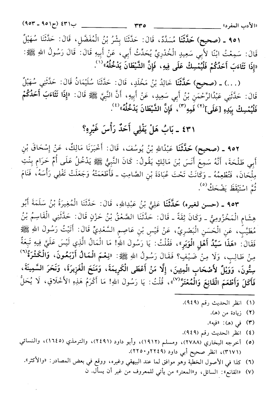 ( .... ) - حَدَّثَنَا خَالِدُ بْنُ مَخْلَدٍ، قَالَ: حَدَّثَنَا سُلَيْمَانُ, قَالَ: حَدَّثَنِي سُهَيْلٌ, قَالَ: حَدَّثَنِي عَبْدُ الرَّحْمَنِ بْنُ أَبِي سَعِيدٍ، عَنْ أَبِيهِ، أَنَّ النَّبِيَّ صَلَّى اللهُ عَلَيهِ وَسَلَّمَ قَالَ: إِذَا تَثَاءَبَ أَحَدُكُمْ فَلْيُمْسِكْ بِيَدِهِ عَلَى فَمِهِ، فَإِنَّ الشَّيْطَانَ يَدْخُلُهُ.