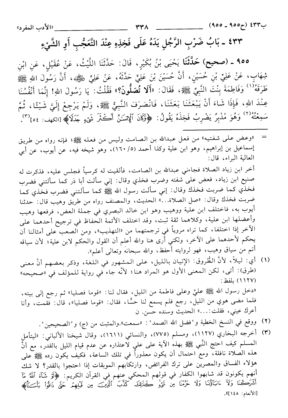 955 - حَدَّثَنَا يَحْيَى بْنُ بُكَيْرٍ، قَالَ: حَدَّثَنَا اللَّيْثُ، عَنْ عُقَيْلٍ، عَنِ ابْنِ شِهَابٍ، عَنْ عَلِيِّ بْنِ حُسَيْنٍ، أَنَّ حُسَيْنَ بْنَ عَلِيٍّ حَدَّثَهُ، عَنْ عَلِيٍّ رَضِيَ اللهُ عَنْهُ، أَنَّ رَسُولَ اللهِ صَلَّى اللهُ عَلَيهِ وَسَلَّمَ طَرَقَهُ وَفَاطِمَةَ بِنْتَ النَّبِيِّ صَلَّى اللهُ عَلَيهِ وَسَلَّمَ، فَقَالَ: أَلاَ تُصَلُّونَ؟ فَقُلْتُ: يَا رَسُولَ اللهِ، إِنَّمَا أَنْفُسُنَا عِنْدَ اللهِ، فَإِذَا شَاءَ أَنْ يَبْعَثَنَا بَعَثَنَا، فَانْصَرَفَ النَّبِيُّ صَلَّى اللهُ عَلَيهِ وَسَلَّمَ، وَلَمْ يَرْجِعْ إِلَيَّ شَيْئًا، ثُمَّ سَمِعْتُه (1) وَهُوَ مُدْبِرٌ يَضْرِبُ فَخِذَهُ يَقُولُ: {وَكَانَ الإِنْسَانُ أَكْثَرَ شَيْءٍ جَدَلاً}.