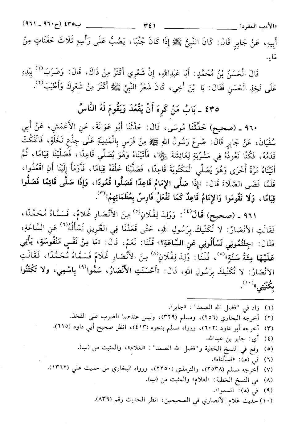 961 - قَالَ: وَوُلِدَ لفلان (1) مِنَ الأَنْصَارِ غُلامٌ، فَسَمَّاهُ مُحَمَّدًا، فَقَالَتِ الأنْصَارُ: لا نُكَنِّيكَ بِرَسُولِ اللهِ، حَتَّى قَعَدْنَا فِي الطَّرِيقِ نَسْأَلُهُ عَنِ السَّاعَةِ، فَقَالَ: جِئْتُمُونِي تَسْأَلُونِي عَنِ السَّاعَةِ؟ قُلْنَا: نَعَمْ، قَالَ: مَا مِنْ نَفْسٍ مَنْفُوسَةٍ، يَأْتِي عَلَيْهَا مِئَةُ سَنَةٍ، قُلْنَا: وُلِدَ لِفلان (2) مِنَ الأَنْصَارِ غُلاَمٌ فَسَمَّاهُ مُحَمَّدًا، فَقَالَتِ الأنْصَارُ: لا نُكَنِّيكَ بِرَسُولِ اللهِ، قَالَ: أَحْسَنَتِ الأَنْصَارُ، سَمُّوا بِاسْمِي، ولا تَكْتَنُوا بِكُنْيَتِي.