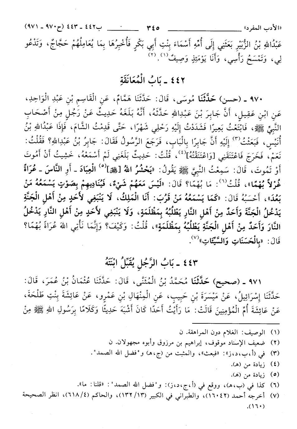 970 - حَدَّثَنَا مُوسَى، قَالَ: حَدَّثَنَا هَمَّامٌ، عَنِ الْقَاسِمِ بْنِ عَبْدِ الْوَاحِدِ، عَنِ ابْنِ عَقِيلٍ، أَنَّ جَابِرَ بْنَ عَبْدِ اللهِ حَدَّثَهُ، أَنَّهُ بَلَغَهُ حَدِيثٌ عَنْ رَجُلٍ مِنْ أَصْحَابِ النَّبِيِّ صَلَّى اللهُ عَلَيهِ وَسَلَّمَ، فَابْتَعْتُ بَعِيرًا, فَشَدَدْتُ إِلَيْهِ رَحْلِي شَهْرًا، حَتَّى قَدِمْتُ الشَّامَ، فَإِذَا عَبْدُ اللهِ بْنُ أُنَيْسٍ، فَبَعَثْتُ إِلَيْهِ: أَنَّ جَابِرًا بِالْبَابِ، فَرَجَعَ الرَّسُولُ, فَقَالَ: جَابِرُ بْنُ عَبْدِ اللهِ؟ فَقُلْتُ: نَعَمْ، فَخَرَجَ فَاعْتَنَقَنِي وَاعْتَنَقْتُهُ، قُلْتُ: حَدِيثٌ بَلَغَنِي لَمْ أَسْمَعْهُ، خَشِيتُ أَنْ أَمُوتَ أَوْ تَمُوتَ، قَالَ: سَمِعْتُ النَّبِيَّ صَلَّى اللهُ عَلَيهِ وَسَلَّمَ يَقُولُ: يَحْشُرُ اللهُ [عز وجل] (1) الْعِبَادَ، -أَوِ النَّاسَ-، عُرَاةً غُرْلاً بُهْمًا، قُلْتُ: مَا بُهْمًا؟ قَالَ: لَيْسَ مَعَهُمْ شَيْءٌ، فَيُنَادِيهِمْ بِصَوْتٍ يَسْمَعُهُ مَنْ بَعُدَ، أَحْسَبُهُ قَالَ: كَمَا يَسْمَعُهُ مَنْ قَرُبَ: أَنَا الْمَلِكُ، لاَ يَنْبَغِي لأَحَدٍ مِنْ أَهْلِ الْجَنَّةِ يَدْخُلُ الْجَنَّةَ, وَأَحَدٌ مِنْ أَهْلِ النَّارِ يَطْلُبُهُ بِمَظْلَمَةٍ، وَلاَ يَنْبَغِي لأَحَدٍ مِنْ أَهْلِ النَّارِ يَدْخُلُ النَّارَ, وَأَحَدٌ مِنْ أَهْلِ الْجَنَّةِ يَطْلُبُهُ بِمَظْلَمَةٍ، قُلْتُ: وَكَيْفَ؟ وَإِنَّمَا نَأْتِي اللهَ عُرَاةً بُهْمًا؟ قَالَ: بِالْحَسَنَاتِ وَالسَّيِّئَاتِ.