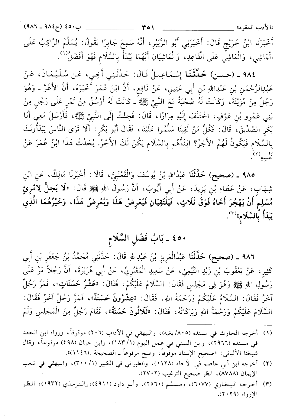 984 - حَدَّثَنَا إِسْمَاعِيلُ, قَالَ: حَدَّثَنِي أَخِي، عَنْ سُلَيْمَانَ، عَنْ عَبْدِ الرَّحْمَنِ بْنِ عَبْدِ اللهِ بْنِ أَبِي عَتِيقٍ، عَنْ نَافِعٍ، أَنَّ ابْنَ عُمَرَ أَخْبَرَهُ، أَنَّ الأَغَرَّ - وَهُوَ رَجُلٌ مِنْ مُزَيْنَةَ، وَكَانَتْ لَهُ صُحْبَةٌ مَعَ النَّبِيِّ صَلَّى اللهُ عَلَيهِ وَسَلَّمَ-، كَانَتْ لَهُ أَوْسُقٌ مِنْ تَمْرٍ عَلَى رَجُلٍ مِنْ بَنِي عَمْرِو بْنِ عَوْفٍ، اخْتَلَفَ إِلَيْهِ مِرَارًا، قَالَ: فَجِئْتُ إِلَى النَّبِيِّ صَلَّى اللهُ عَلَيهِ وَسَلَّمَ، فَأَرْسَلَ مَعِي أَبَا بَكْرٍ الصِّدِّيقَ، قَالَ: فَكُلُّ مَنْ لَقِينَا سَلَّمُوا عَلَيْنَا، فَقَالَ أَبُو بَكْرٍ: أَلاَ تَرَى النَّاسَ يَبْدَأُونَكَ بِالسَّلاَمِ فَيَكُونُ لَهُمُ الأَجْرُ؟ ابْدَأْهُمْ بِالسَّلاَمِ يَكُنْ لَكَ الأَجْرُ.