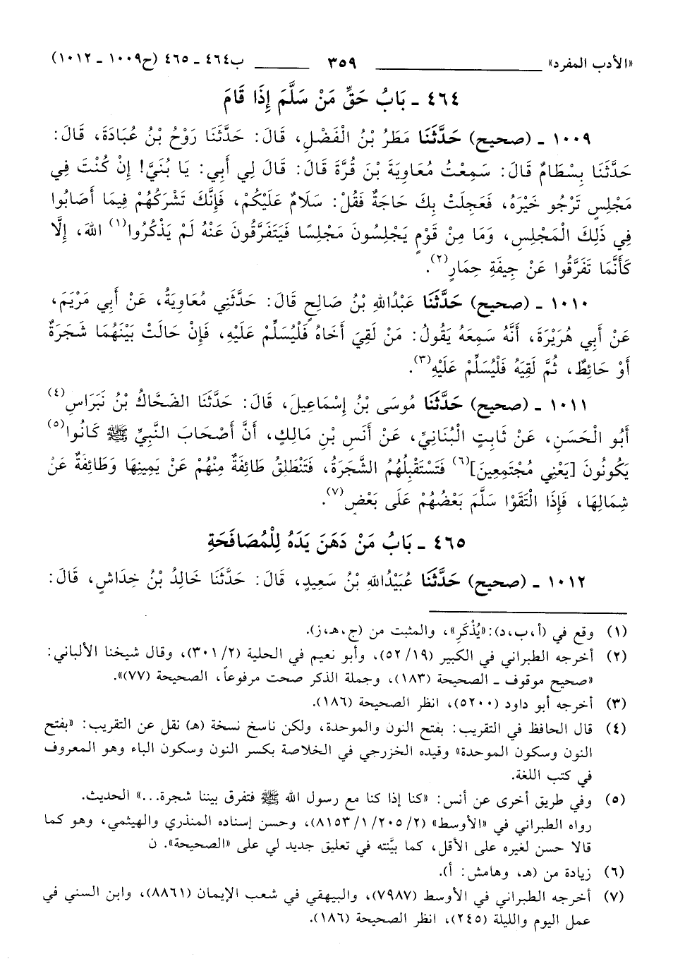 1011 - حَدَّثَنَا مُوسَى بْنُ إِسْمَاعِيلَ، قَالَ: حَدَّثَنَا الضَّحَّاكُ بْنُ نَبَرَاسٍ (1)، أَبُو الْحَسَنِ، عَنْ ثَابِتٍ الْبُنَانِيِّ، عَنْ أَنَسِ بْنِ مَالِكٍ، أَنَّ أَصْحَابَ النَّبِيِّ صَلَّى اللهُ عَلَيهِ وَسَلَّمَ كَانُوا يَكُونُونَ [يعني مُجْتَمِعِينَ] (2) فَتَسْتَقْبِلُهُمُ الشَّجَرَةُ، فَتَنْطَلِقُ طَائِفَةٌ مِنْهُمْ عَنْ يَمِينِهَا, وَطَائِفَةٌ عَنْ شِمَالِهَا، فَإِذَا الْتَقَوْا سَلَّمَ بَعْضُهُمْ عَلَى بَعْضٍ.
