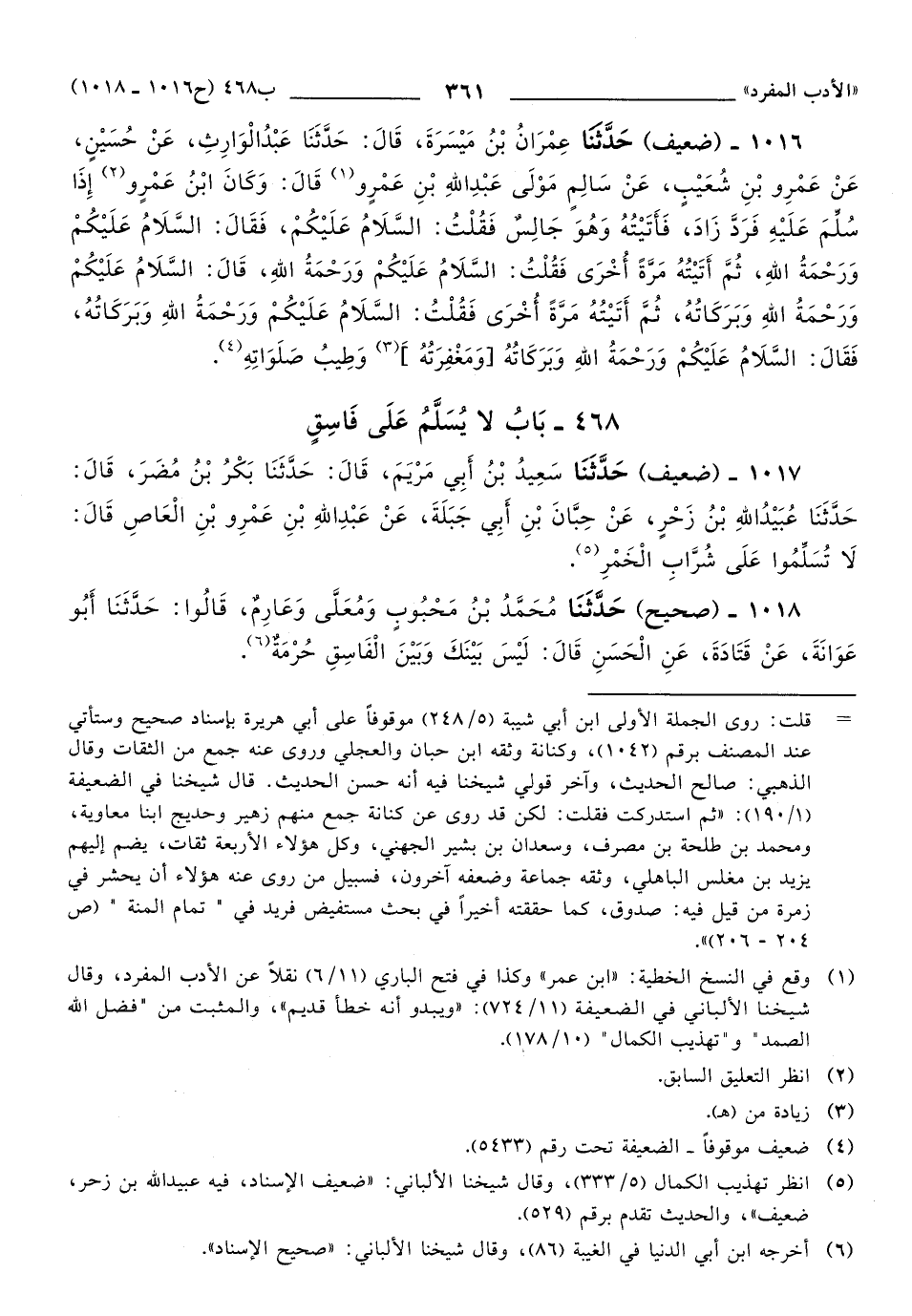 1016 - حَدَّثَنَا عِمْرَانُ بْنُ مَيْسَرَةَ، قَالَ: حَدَّثَنَا عَبْدُ الْوَارِثِ، عَنْ حُسَيْنٍ، عَنْ عَمْرِو بْنِ شُعَيْبٍ، عَنْ سَالِمٍ, مَوْلَى عَبْدِ اللهِ بْنِ عَمْرٍو, قَالَ: كَانَ ابْنُ عَمْرٍو إِذَا سُلِّمَ عَلَيْهِ فَرَدَّ زَادَ، فَأَتَيْتُهُ وَهُوَ جَالِسٌ, فَقُلْتُ: السَّلاَمُ عَلَيْكُمْ، فَقَالَ: السَّلاَمُ عَلَيْكُمْ وَرَحْمَةُ اللهِ، ثُمَّ أَتَيْتُهُ مَرَّةً أُخْرَى, فَقُلْتُ: السَّلاَمُ عَلَيْكُمْ وَرَحْمَةُ اللهِ، قَالَ: السَّلاَمُ عَلَيْكُمْ وَرَحْمَةُ اللهِ وَبَرَكَاتُهُ، ثُمَّ أَتَيْتُهُ مَرَّةً أُخْرَى, فَقُلْتُ: السَّلاَمُ عَلَيْكُمْ وَرَحْمَةُ اللهِ وَبَرَكَاتُهُ، فَقَالَ: السَّلاَمُ عَلَيْكُمْ وَرَحْمَةُ اللهِ وَبَرَكَاتُهُ [ومغفرته] (1)، وَطَيِّبُ صَلَوَاتِهِ.