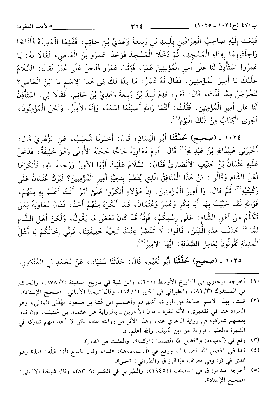 1024 - حَدَّثَنَا أَبُو الْيَمَانِ، قَالَ: أَخْبَرَنَا شُعَيْبٌ، عَنِ الزُّهْرِيِّ, قَالَ: أَخْبَرَنِي عُبَيْدُ اللهِ بْنُ عَبْدِ اللهِ, قَالَ: قَدِمَ مُعَاوِيَةُ حَاجًّا حَجَّتَهُ الأُولَى وَهُوَ خَلِيفَةٌ، فَدَخَلَ عَلَيْهِ عُثْمَانُ بْنُ حُنَيْفٍ الأَنْصَارِيُّ فَقَالَ: السَّلاَمُ عَلَيْكَ أَيُّهَا الأَمِيرُ وَرَحْمَةُ اللهِ، فَأَنْكَرَهَا أَهْلُ الشَّامِ, وَقَالُوا: مَنْ هَذَا الْمُنَافِقُ الَّذِي يُقَصِّرُ بِتَحِيَّةِ أَمِيرِ الْمُؤْمِنِينَ؟ فَبَرَكَ عُثْمَانُ عَلَى رُكْبَتَيْهِ, ثُمَّ قَالَ: يَا أَمِيرَ الْمُؤْمِنِينَ، إِنَّ هَؤُلاَءِ أَنْكَرُوا عَلَيَّ أَمْرًا أَنْتَ أَعْلَمُ بِهِ مِنْهُمْ، فَوَاللَّهِ لَقَدْ حَيَّيْتُ بِهَا أَبَا بَكْرٍ وَعُمَرَ وَعُثْمَانَ، فَمَا أَنْكَرَهُ مِنْهُمْ أَحَدٌ، فَقَالَ مُعَاوِيَةُ لِمَنْ تَكَلَّمَ مِنْ أَهْلِ الشَّامِ: عَلَى رِسْلِكُمْ، فَإِنَّهُ قَدْ كَانَ بَعْضُ مَا يَقُولُ، وَلَكِنَّ أَهْلَ الشَّامِ لَمَّا حَدَثَتْ هَذِهِ الْفِتَنُ، قَالُوا: لاَ تُقَصَّرُ عِنْدَنَا تَحِيَّةُ خَلِيفَتِنَا، فَإِنِّي إِخَالُكُمْ يَا أَهْلَ الْمَدِينَةِ تَقُولُونَ لِعَامِلِ الصَّدَقَةِ: أَيُّهَا الأَمِيرُ.