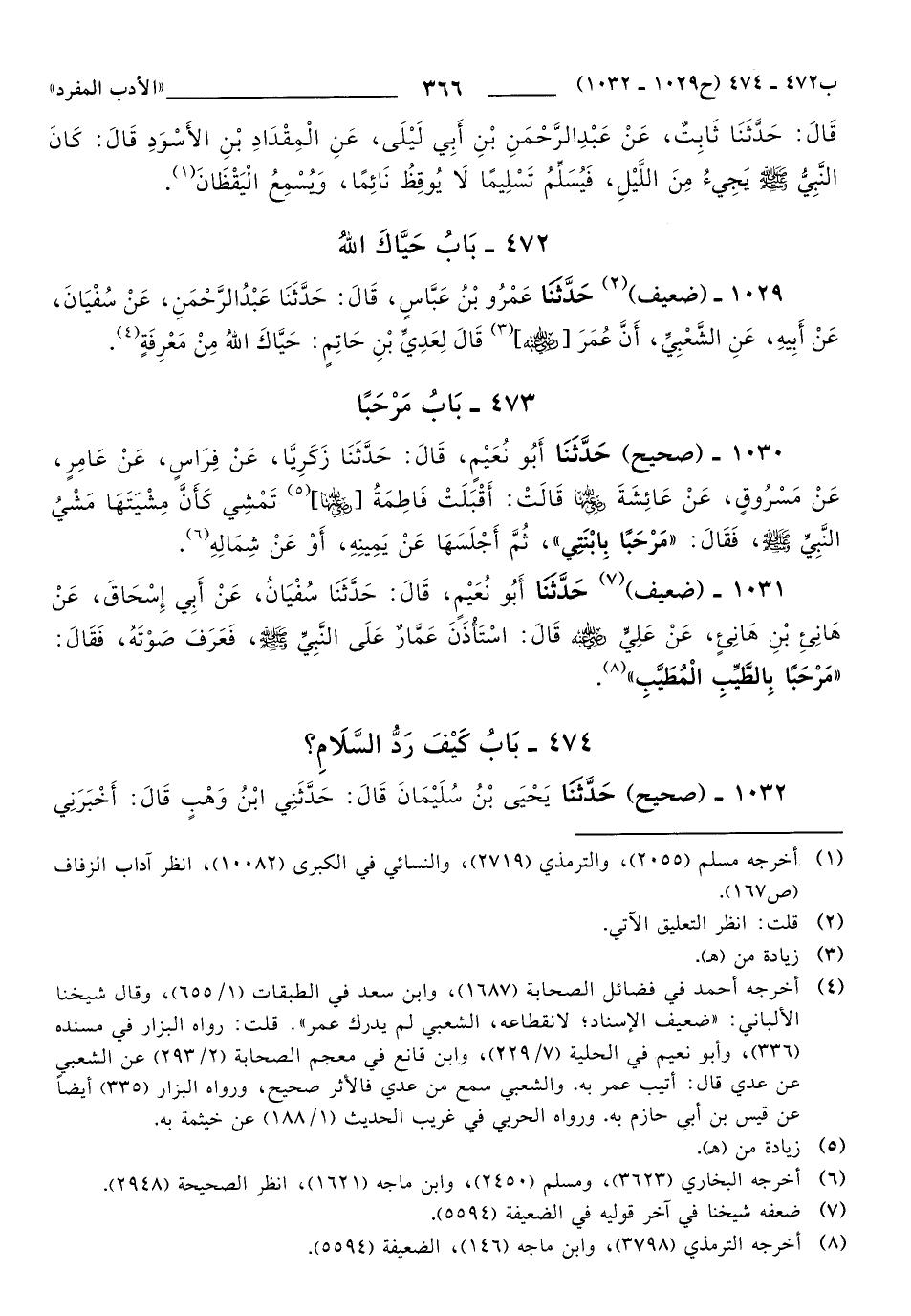 1032 - حَدَّثَنَا يَحْيَى بْنُ سُلَيْمَانَ, قَالَ: حَدَّثَنِي ابْنُ وَهْبٍ, قَالَ: أَخْبَرَنِي حَيْوَةُ، عَنْ عُقْبَةَ بْنِ مُسْلِمٍ، عَنْ عَبْدِ اللهِ بْنِ عَمْرٍو, قَالَ: بَيْنَمَا نَحْنُ جُلُوسٌ عِنْدَ النَّبِيِّ صَلَّى اللهُ عَلَيهِ وَسَلَّمَ فِي ظِلِّ شَجَرَةٍ بَيْنَ مَكَّةَ وَالْمَدِينَةِ، إِذْ جَاءَ أَعْرَابِيٌّ مِنَ أجلف (1) النَّاسِ وَأَشَدِّهِمْ, فَقَالَ: السَّلامُ عَلَيْكُمْ، فَقَالُوا: وَعَلَيْكُمُ [السلام] (2).