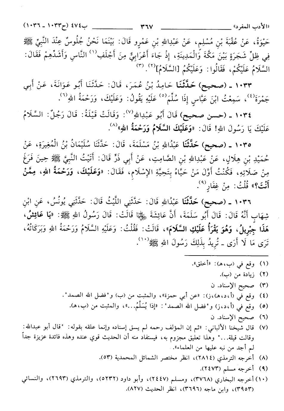 1033 - حَدَّثَنَا حَامِدُ بْنُ عُمَرَ، قَالَ: حَدَّثَنَا أَبُو عَوَانَةَ، عَنْ أَبِي جَمْرَةَ، سَمِعْتُ ابْنَ عَبَّاسٍ إِذَا سُلِّمَ عَلَيْهِ يَقُولُ: وَعَلَيْكَ، وَرَحْمَةُ اللهِ.