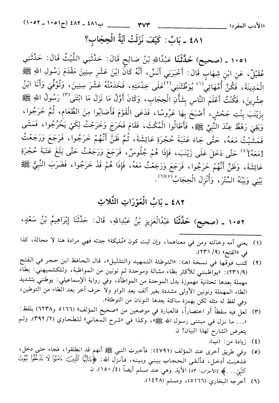 1051 - حَدَّثَنَا عَبْدُ اللهِ بْنُ صَالِحٍ, قَالَ: حَدَّثَنِي اللَّيْثُ, قَالَ: حَدَّثَنِي عُقَيْلٌ، عَنِ ابْنِ شِهَابٍ, قَالَ: أَخْبَرَنِي أَنَسٌ، أَنَّهُ كَانَ ابْنَ عَشْرِ سِنِينَ مَقْدَمَ رَسُولِ اللهِ صَلَّى اللهُ عَلَيهِ وَسَلَّمَ الْمَدِينَةَ، فَكُنَّ أُمَّهَاتِي يُوطِئْنَنِي عَلَى خِدْمَتِهِ، فَخَدَمْتُهُ عَشْرَ سِنِينَ، وَتُوُفِّيَ وَأَنَا ابْنُ عِشْرِينَ، فَكُنْتُ أَعْلَمَ النَّاسِ بِشَأْنِ الْحِجَابِ، وكَانَ أَوَّلُ مَا نَزَلَ مَا ابْتَنَى رَسُولُ اللهِ صَلَّى اللهُ عَلَيهِ وَسَلَّمَ بِزَيْنَبَ بِنْتِ جَحْشٍ، أَصْبَحَ بِهَا عَرُوسًا، فَدَعَى الْقَوْمَ فَأَصَابُوا مِنَ الطَّعَامِ، ثُمَّ خَرَجُوا، وَبَقِيَ رَهْطٌ عِنْدَ النَّبِيِّ صَلَّى اللهُ عَلَيهِ وَسَلَّمَ، فَأَطَالُوا الْمُكْثَ، فَقَامَ, فَخَرَجَ وَخَرَجْتُ لِكَيْ يَخْرُجُوا، فَمَشَى فَمَشَيْتُ مَعَهُ، حَتَّى جَاءَ عَتَبَةَ حُجْرَةِ عَائِشَةَ، ثُمَّ ظَنَّ أَنَّهُمْ خَرَجُوا، فَرَجَعَ وَرَجَعْتُ [معه] (1) , حَتَّى دَخَلَ عَلَى زَيْنَبَ، فَإِذَا هُمْ جُلُوسٌ، فَرَجَعَ وَرَجَعْتُ, حَتَّى بَلَغَ عَتَبَةَ حُجْرَةِ عَائِشَةَ، وَظَنَّ أَنَّهُمْ خَرَجُوا، فَرَجَعَ وَرَجَعْتُ مَعَهُ، فَإِذَا هُمْ قَدْ خَرَجُوا، فَضَرَبَ النَّبِيُّ صَلَّى اللهُ عَلَيهِ وَسَلَّمَ بَيْنِي وَبَيْنَهُ السِّتْرَ، وَأَنْزَلَ الْحِجَابَ.