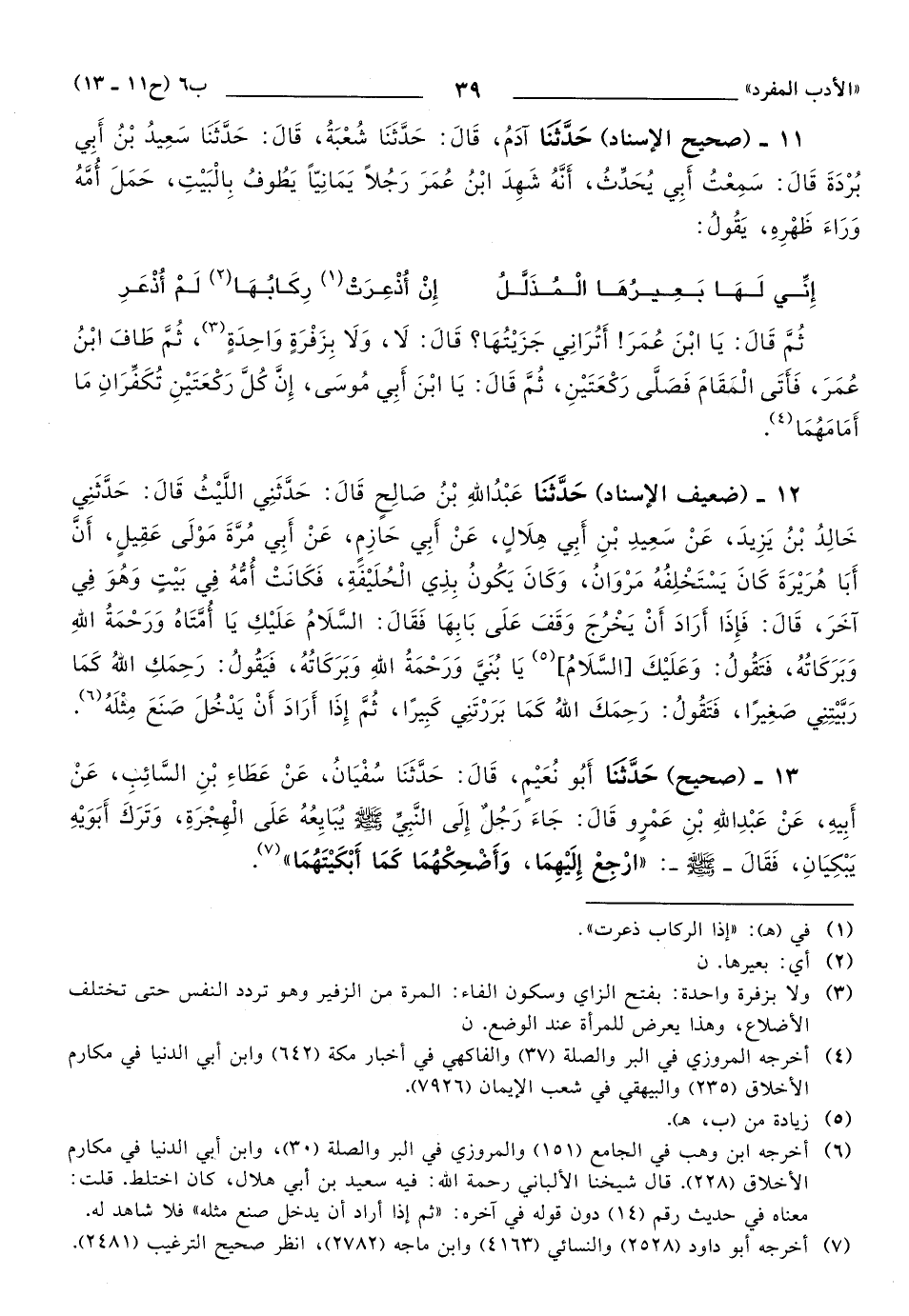 11 - حَدَّثَنَا آدَمُ، قَالَ: حَدَّثَنَا شُعْبَةُ، قَالَ: حَدَّثَنَا سَعِيدُ بْنُ أَبِي بُرْدَةَ قَالَ: سَمِعْتُ أَبِي يُحَدِّثُ، أَنَّهُ شَهِدَ ابْنَ عُمَرَ رَجُلاً يمانياً يَطُوفُ بِالْبَيْتِ، حَمَلَ أُمَّهُ وَرَاءَ ظَهْرِهِ، يَقُولُ:
