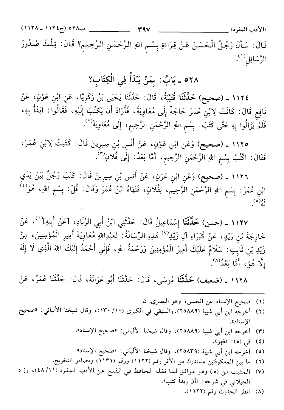 1124 - حَدَّثَنَا قُتَيْبَةُ، قَالَ: حَدَّثَنَا يَحْيَى بْنُ زَكَرِيَّا، عَنِ ابْنِ عَوْنٍ، عَنْ نَافِعٍ, قَالَ: كَانَتْ لابْنِ عُمَرَ حَاجَةٌ إِلَى مُعَاوِيَةَ، فَأَرَادَ أَنْ يَكْتُبَ إِلَيْهِ، فَقَالُوا: ابْدَأْ بِهِ، فَلَمْ يَزَالُوا بِهِ, حَتَّى كَتَبَ: بِسْمِ اللهِ الرَّحْمَنِ الرَّحِيمِ، إِلَى مُعَاوِيَةَ.