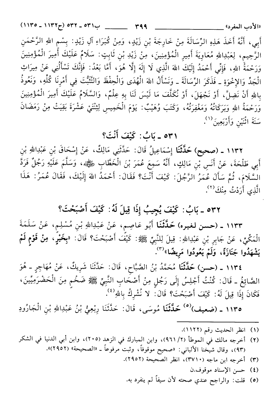1132 - حَدَّثَنَا إِسْمَاعِيلُ, قَالَ: حَدَّثَنِي مَالِكٌ، عَنْ إِسْحَاقَ بْنِ عَبْدِ اللهِ بْنِ أَبِي طَلْحَةَ، عَنْ أَنَسِ بْنِ مَالِكٍ، أَنَّهُ سَمِعَ عُمَرَ بْنَ الْخَطَّابِ رَضِيَ اللهُ عَنْهُ، وَسَلَّمَ عَلَيْهِ رَجُلٌ فَرَدَّ السَّلاَمَ، ثُمَّ سَأَلَ عُمَرُ الرَّجُلَ: كَيْفَ أَنْتَ؟ فَقَالَ: أَحْمَدُ اللهَ إِلَيْكَ، فَقَالَ عُمَرُ: هَذَا الَّذِي أَرَدْتُ مِنْكَ.
