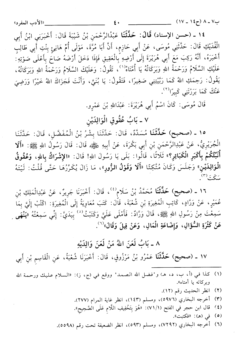 14 - قال: حَدَّثَنَا عَبْدُ الرَّحْمَنِ بْنُ شَيْبَةَ, قَالَ: أَخْبَرَنِي ابْنُ أَبِي الْفُدَيْكِ, قَالَ: حَدَّثَنِي مُوسَى، عَنْ أَبِي حَازِمٍ، أَنَّ أَبَا مُرَّةَ، مَوْلَى أُمِّ هَانِئِ بِنْت أَبِي طَالِبٍ أَخْبَرَهُ، أَنَّهُ رَكِبَ مَعَ أَبِي هُرَيْرَةَ, إِلَى أَرْضِهِ بِالْعَقِيقِ, فَإِذَا دَخَلَ أَرْضَهُ صَاحَ بِأَعْلَى صَوْتِهِ: عَلَيْكِ السَّلاَمُ وَرَحْمَةُ اللهِ وَبَرَكَاتُهُ يَا أُمَّتَاهُ، تَقُولُ: وَعَلَيْكَ السَّلاَمُ وَرَحْمَةُ اللهِ وَبَرَكَاتُهُ، يَقُولُ: رَحِمَكِ اللهُ كَمَا رَبَّيْتِنِي صَغِيرًا، فَتَقُولُ: يَا بُنَيَّ، وَأَنْتَ فَجَزَاكَ اللهُ خَيْرًا وَرَضِيَ عَنْكَ كَمَا بَرَرْتَنِي كَبِيرًا.