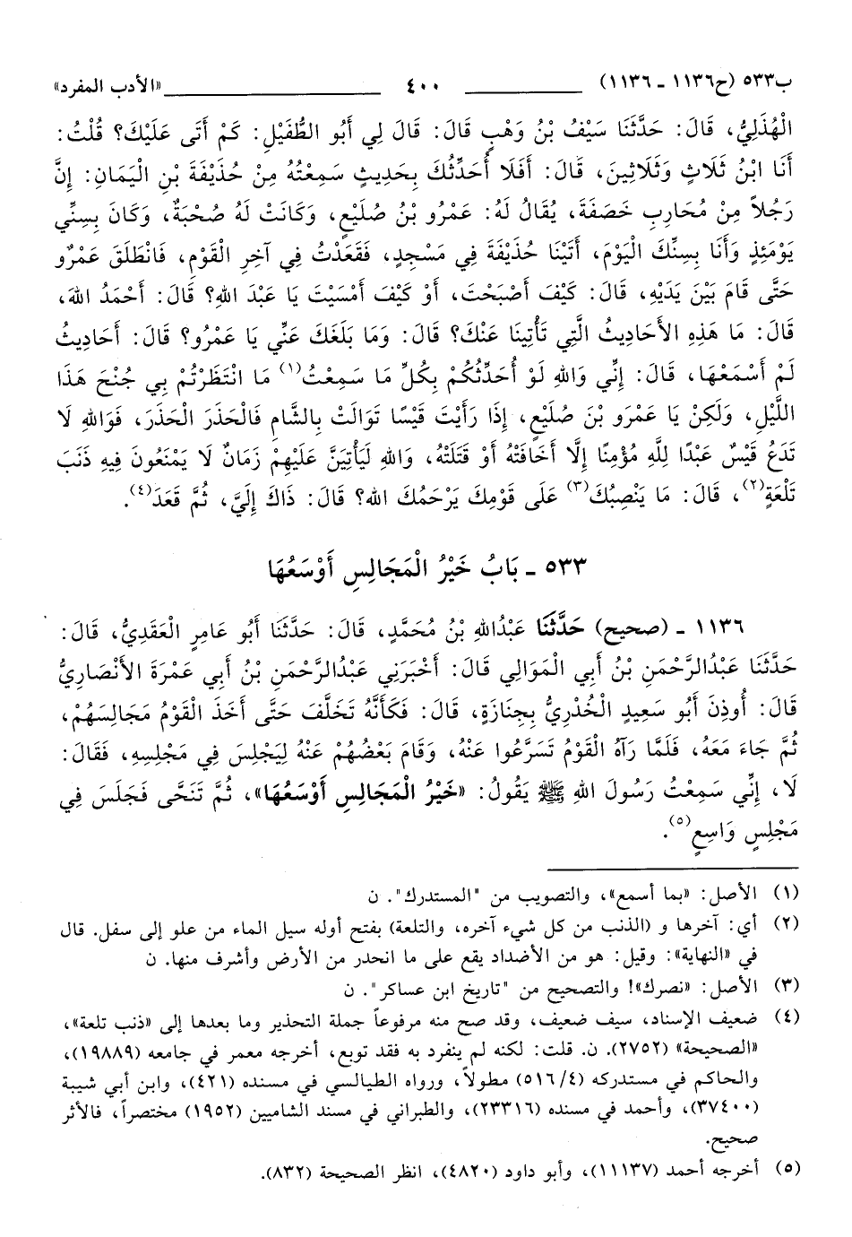 1136 - حَدَّثَنَا عَبْدُ اللهِ بْنُ مُحَمَّدٍ، قَالَ: حَدَّثَنَا أَبُو عَامِرٍ الْعَقَدِيُّ، قَالَ: حَدَّثَنَا عَبْدُ الرَّحْمَنِ بْنُ أَبِي الْمَوَالِي, قَالَ: أَخْبَرَنِي عَبْدُ الرَّحْمَنِ بْنُ أَبِي عَمْرَةَ الأَنْصَارِيُّ, قَالَ: أُوذِنَ أَبُو سَعِيدٍ الْخُدْرِيُّ بِجِنَازَةٍ، قَالَ: فَكَأَنَّهُ تَخَلَّفَ, حَتَّى أَخَذَ الْقَوْمُ مَجَالِسَهُمْ، ثُمَّ جَاءَ معه (1)، فَلَمَّا رَآهُ الْقَوْمُ تَسرَّعوا (2) عَنْهُ، وَقَامَ بَعْضُهُمْ عَنْهُ لِيَجْلِسَ فِي مَجْلِسِهِ، فَقَالَ: لاَ، إِنِّي سَمِعْتُ رَسُولَ اللهِ صَلَّى اللهُ عَلَيهِ وَسَلَّمَ يَقُولُ: خَيْرُ الْمَجَالِسِ أَوْسَعُهَا، ثُمَّ تَنَحَّى فَجَلَسَ فِي مَجْلِسٍ وَاسِعٍ.