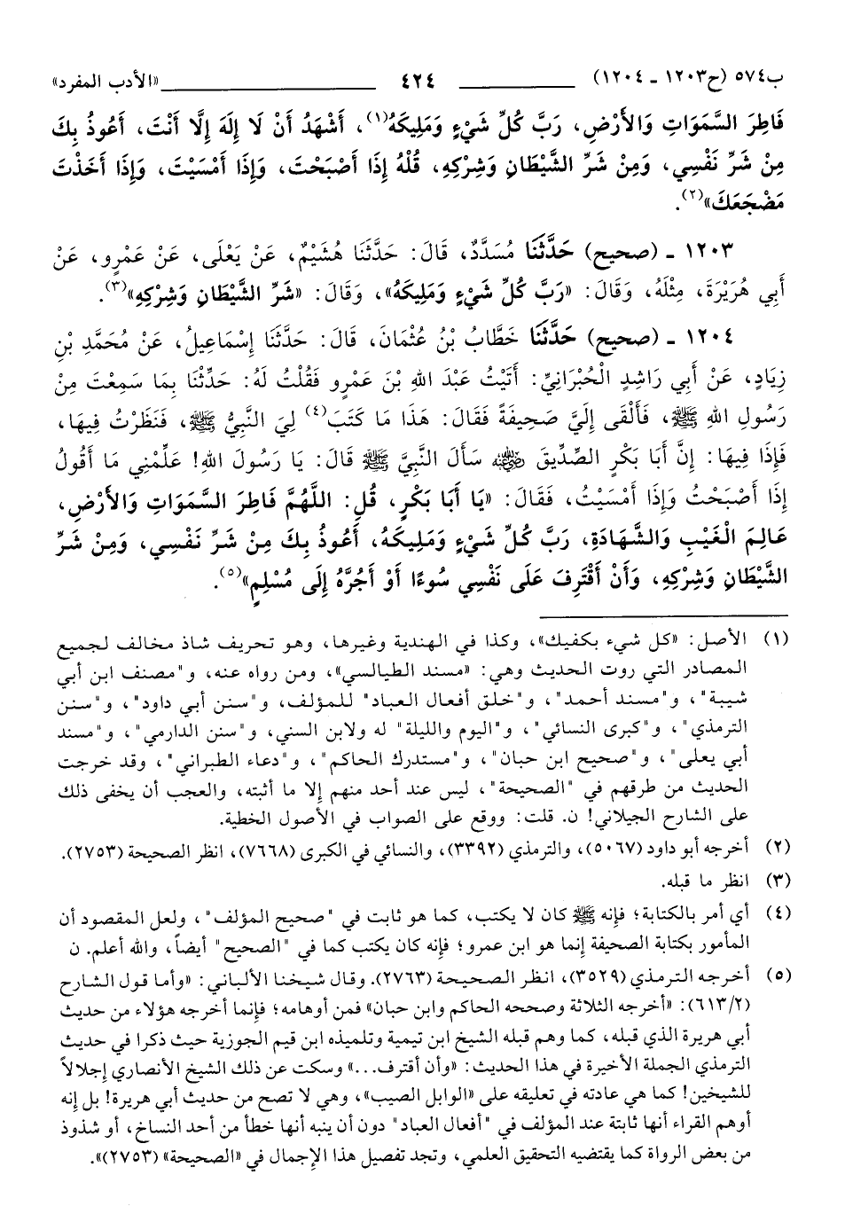 1204 - حَدَّثَنَا خَطَّابُ بْنُ عُثْمَانَ، قَالَ: حَدَّثَنَا إِسْمَاعِيلُ، عَنْ مُحَمَّدِ بْنِ زِيَادٍ، عَنْ أَبِي رَاشِدٍ الْحُبْرَانِيِّ: أَتَيْتُ عَبْدَ اللهِ بْنَ عَمْرٍو, فَقُلْتُ لَهُ: حَدِّثْنَا بِمَا سَمِعْتَ مِنْ رَسُولِ اللهِ صَلَّى اللهُ عَلَيهِ وَسَلَّمَ، فَأَلْقَى إِلَيَّ صَحِيفَةً فَقَالَ: هَذَا مَا كَتَبَ لِيَ النَّبِيُّ صَلَّى اللهُ عَلَيهِ وَسَلَّمَ, فَنَظَرْتُ فِيهَا، فَإِذَا فِيهَا: إِنَّ أَبَا بَكْرٍ الصِّدِّيقَ رَضِيَ اللهُ عَنْهُ سَأَلَ النَّبِيَّ صَلَّى اللهُ عَلَيهِ وَسَلَّمَ قَالَ: يَا رَسُولَ اللهِ، عَلِّمْنِي مَا أَقُولُ إِذَا أَصْبَحْتُ وَإِذَا أَمْسَيْتُ، فَقَالَ: يَا أَبَا بَكْرٍ، قُلِ: اللَّهُمَّ فَاطِرَ السَّمَاوَاتِ وَالأَرْضِ، عَالِمَ الْغَيْبِ وَالشَّهَادَةِ، رَبَّ كُلِّ شَيْءٍ وَمَلِيكَهُ، أَعُوذُ بِكَ مِنْ شَرِّ نَفْسِي، وَمِنْ شَرِّ الشَّيْطَانِ وَشِرْكِهِ، وَأَنْ أَقْتَرِفَ عَلَى نَفْسِي سُوءًا أَوْ أَجُرُّهُ إِلَى مُسْلِمٍ.