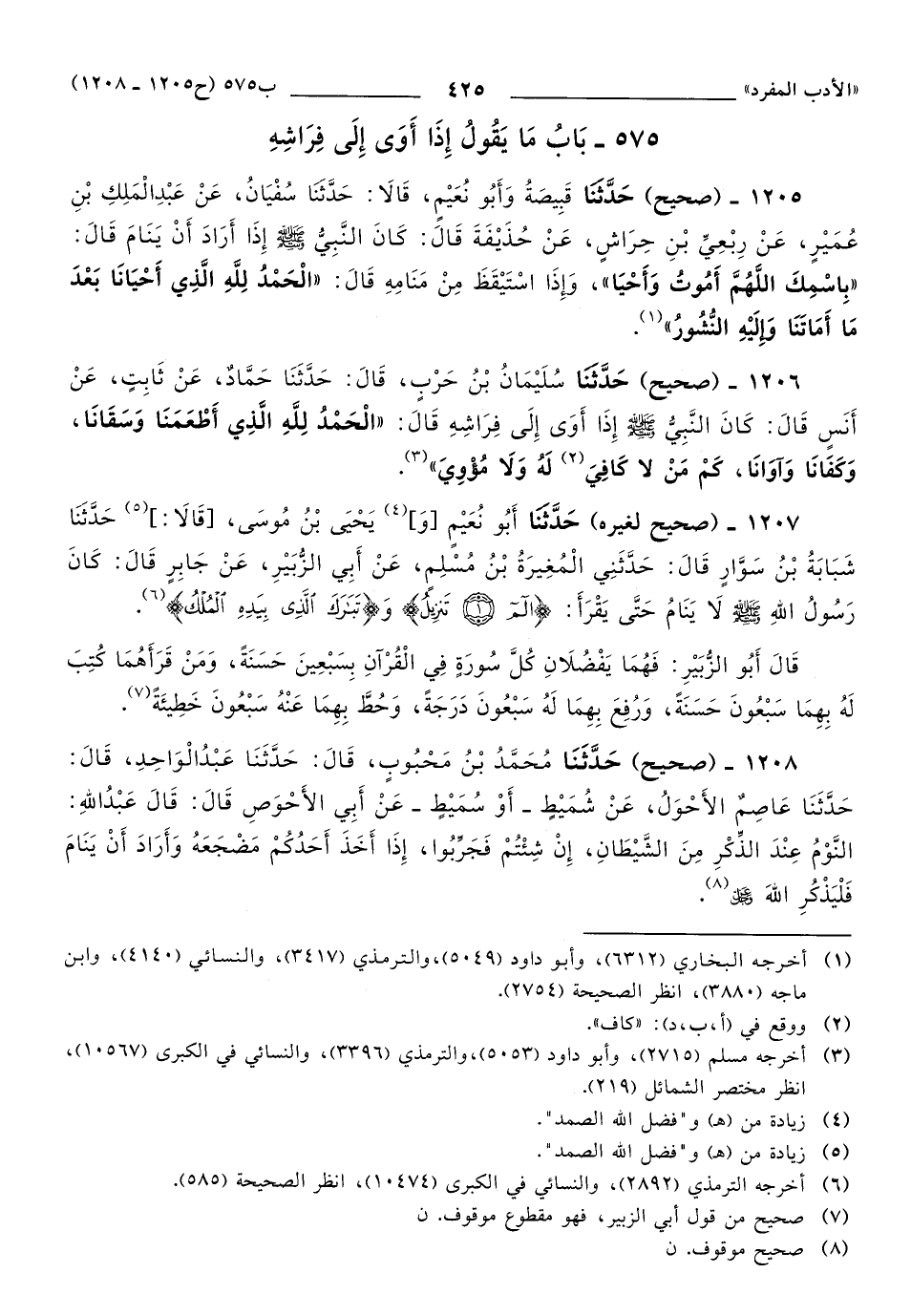 1206 - حَدَّثَنَا سُلَيْمَانُ بْنُ حَرْبٍ، قَالَ: حَدَّثَنَا حَمَّادٌ، عَنْ ثَابِتٍ، عَنْ أَنَسٍ, قَالَ: كَانَ النَّبِيُّ صَلَّى اللهُ عَلَيهِ وَسَلَّمَ إِذَا أَوَى إِلَى فِرَاشِهِ قَالَ: الْحَمْدُ لِلَّهِ الَّذِي أَطْعَمَنَا وَسَقَانَا، وَكَفَانَا وَآوَانَا، كَمْ مِمَّنْ (1) لاَ كَافِيَ لَهُ وَلا مُؤْوِيَ.