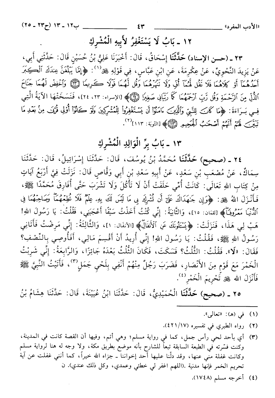 23 - حَدَّثَنَا إِسْحَاقُ، قَالَ: أَخْبَرَنَا عَلِيُّ بْنُ حُسَيْنٍ, قَالَ: حَدَّثَنِي أَبِي، عَنْ يَزِيدَ النَّحْوِيِّ، عَنْ عِكْرِمَةَ، عَنِ ابْنِ عَبَّاسٍ، فِي قَوْلِهِ عَزَّ وَجَلَّ: {إِمَّا يَبْلُغَنَّ عِنْدَكَ الْكِبَرَ أَحَدُهُمَا أَوْ كِلاَهُمَا فَلاَ تَقُلْ لَهُمَا أُفٍّ وَلاَ تَنْهَرْهُمَا وَقُلْ لَهُمَا قَوْلاً كَرِيمًا * وَاخْفِضْ لَهُمَا جَنَاحَ الذُّلِّ مِنَ الرَّحْمَةِ وَقُلْ رَبِّ ارْحَمْهُمَا كَمَا رَبَّيَانِي صَغِيرًا} فَنَسَخَتْهَا الآيَةُ التي فِي بَرَاءَةَ: {مَا كَانَ لِلنَّبِيِّ وَالَّذِينَ آمَنُوا أَنْ يَسْتَغْفِرُوا لِلْمُشْرِكِينَ وَلَوْ كَانُوا أُولِي قُرْبَى مِنْ بَعْدِ مَا تَبَيَّنَ لَهُمْ أَنَّهُمْ أَصْحَابُ الْجَحِيمِ}.""