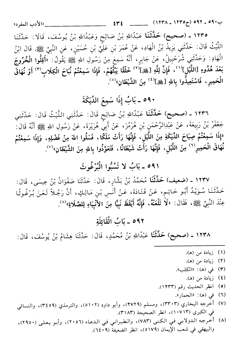 1236 - حَدَّثَنَا عَبْدُ اللهِ بْنُ صَالِحٍ, قَالَ: حَدَّثَنِي اللَّيْثُ, قَالَ: حَدَّثَنِي جَعْفَرُ بْنُ رَبِيعَةَ، عَنْ عَبْدِ الرَّحْمَنِ بْنِ هُرْمُزَ، عَنْ أَبِي هُرَيْرَةَ، عَنْ رَسُولِ اللهِ صَلَّى اللهُ عَلَيهِ وَسَلَّمَ أَنَّهُ قَالَ: إِذَا سَمِعْتُمْ صِيَاحَ الدِّيَكَةِ مِنَ اللَّيْلِ، فَإِنَّهَا رَأَتْ مَلَكًا، فَسَلُوا اللهَ مِنْ فَضْلِهِ، وَإِذَا سَمِعْتُمْ نُهَاقَ الْحَمِيرِ مِنَ اللَّيْلِ، فَإِنَّهَا رَأَتْ شَيْطَانًا، فَتَعَوَّذُوا بِاللهِ مِنَ الشَّيْطَانِ.