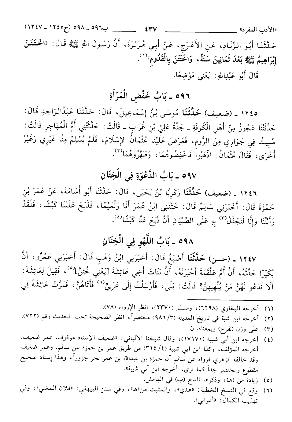 1246 - حَدَّثَنَا زَكَرِيَّا بْنُ يَحْيَى، قَالَ: حَدَّثَنَا أَبُو أُسَامَةَ، عَنْ عُمَرَ بْنِ حَمْزَةَ, قَالَ: أَخْبَرَنِي سَالِمٌ, قَالَ: خَتَنَنِي ابْنُ عُمَرَ أَنَا وَنُعَيْمًا، فَذَبَحَ عَلَيْنَا كَبْشًا، فَلَقَدْ رَأَيْتُنَا وَإِنَّا لَنَجْذَلُ بِهِ عَلَى الصِّبْيَانِ, أَنْ ذَبَحَ عَنَّا كَبْشًا.
