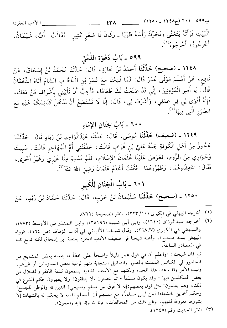 1249 - حَدَّثَنَا مُوسَى، قَالَ: حَدَّثَنَا عَبْدُ الْوَاحِدِ بْنُ زِيَادٍ, قَالَ: حَدَّثَتْنَا عَجُوزٌ مِنْ أَهْلِ الْكُوفَةِ, جَدَّةُ عَلِيِّ بْنِ غُرَابٍ, قَالَتْ: حَدَّثَتْنِي أُمُّ الْمُهَاجِرِ, قَالَتْ: سُبِيتُ وَجَوَارِي مِنَ الرُّومِ، فَعَرَضَ عَلَيْنَا عُثْمَانُ الإِسْلاَمَ، فَلَمْ يُسْلِمْ مِنَّا غَيْرِي وَغَيْرُ أُخْرَى، فَقَالَ: اخْفِضُوهُمَا، وَطَهِّرُوهُمَا, فَكُنْتُ أَخْدُمُ عُثْمَانَ رضي الله عنه.