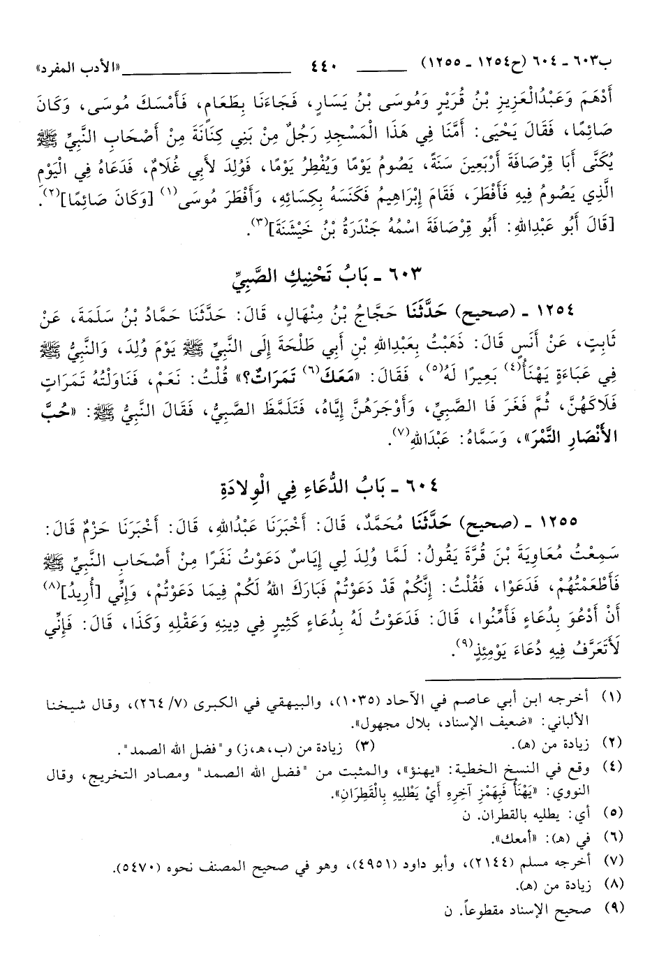 1254 - حَدَّثَنَا حَجَّاجُ بْنُ مِنْهَالٍ، قَالَ: حَدَّثَنَا حَمَّادُ بْنُ سَلَمَةَ، عَنْ ثَابِتٍ، عَنْ أَنَسٍ, قَالَ: ذَهَبْتُ بِعَبْدِ اللهِ بْنِ أَبِي طَلْحَةَ إِلَى النَّبِيِّ صَلَّى اللهُ عَلَيهِ وَسَلَّمَ يَوْمَ وُلِدَ، وَالنَّبِيُّ صَلَّى اللهُ عَلَيهِ وَسَلَّمَ فِي عَبَاءَةٍ يَهْنَأُ (1) بَعِيراً لَهُ، فَقَالَ: مَعَكَ تَمَرَاتٌ؟ قُلْتُ: نَعَمْ، فَنَاوَلْتُهُ تَمَرَاتٍ فَلاَكَهُنَّ، ثُمَّ فَغَرَ فَا الصَّبِيِّ، وَأَوْجَرَهُنَّ إِيَّاهُ، فَتَلَمَّظَ الصَّبِيُّ، فَقَالَ النَّبِيُّ صَلَّى اللهُ عَلَيهِ وَسَلَّمَ: حُبَّ الأَنْصَارِ التَّمْرَ، وَسَمَّاهُ: عَبْدَ اللهِ.