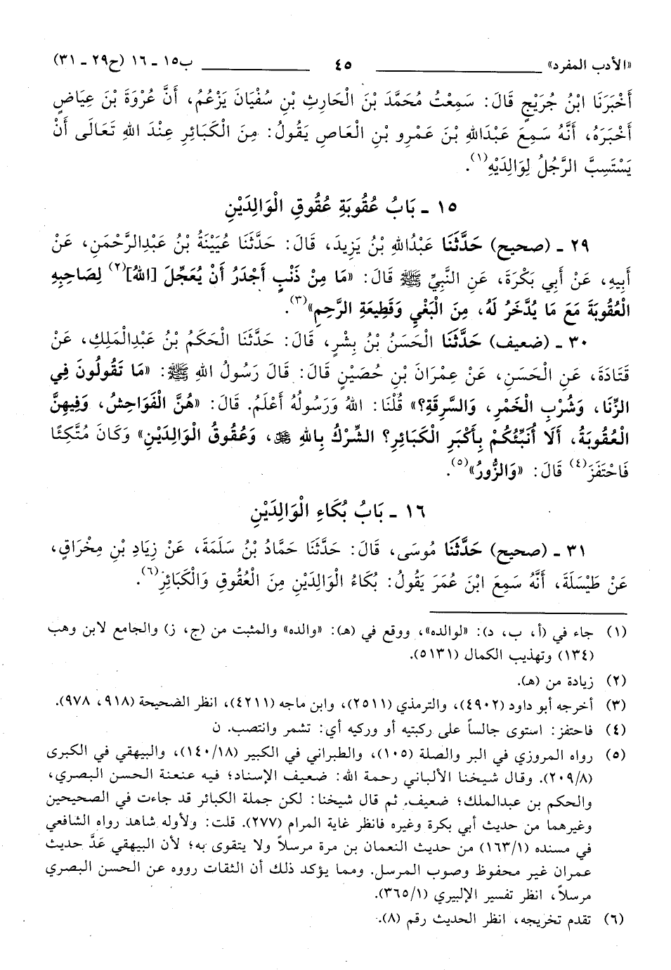 31 - حَدَّثَنَا مُوسَى، قَالَ: حَدَّثَنَا حَمَّادُ بْنُ سَلَمَةَ، عَنْ زِيَادِ بْنِ مِخْرَاقٍ، عَنْ طَيْسَلَةَ، أَنَّهُ سَمِعَ ابْنَ عُمَرَ, يَقُولُ: بُكَاءُ الْوَالِدَيْنِ مِنَ الْعُقُوقِ وَالْكَبَائِرِ.