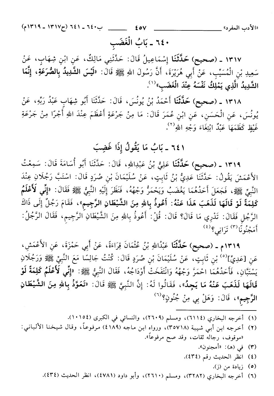 1319م- حَدَّثَنَا عَبْدُ اللهِ بْنُ عُثْمَانَ قِرَاءَةً، عَنْ أَبِي حَمْزَةَ، عَنِ الأَعْمَشِ، عَنْ عَدِيِّ بْنِ ثَابِتٍ، عَنْ سُلَيْمَانَ بْنِ صُرَدٍ، قَالَ: كُنْتُ جَالِسًا مَعَ النَّبِيِّ صَلَّى اللهُ عَلَيهِ وَسَلَّمَ وَرَجُلاَنِ يَسْتَبَّانِ، فَأَحَدُهُمَا احْمَرَّ وَجْهُهُ، وَانْتَفَخَتْ أَوْدَاجُهُ، فَقَالَ النَّبِيُّ صَلَّى اللهُ عَلَيهِ وَسَلَّمَ: إِنِّي لأَعْلَمُ كَلِمَةً لَوْ قَالَهَا لَذَهَبَ عَنْهُ مَا يَجِدُ، فَقَالُوا لَهُ: إِنَّ النَّبِيَّ صَلَّى اللهُ عَلَيهِ وَسَلَّمَ قَالَ: تَعَوَّذْ بِاللهِ مِنَ الشَّيْطَانِ الرَّجِيمِ، قَالَ: وَهَلْ بِي مِنْ جُنُونٍ؟.