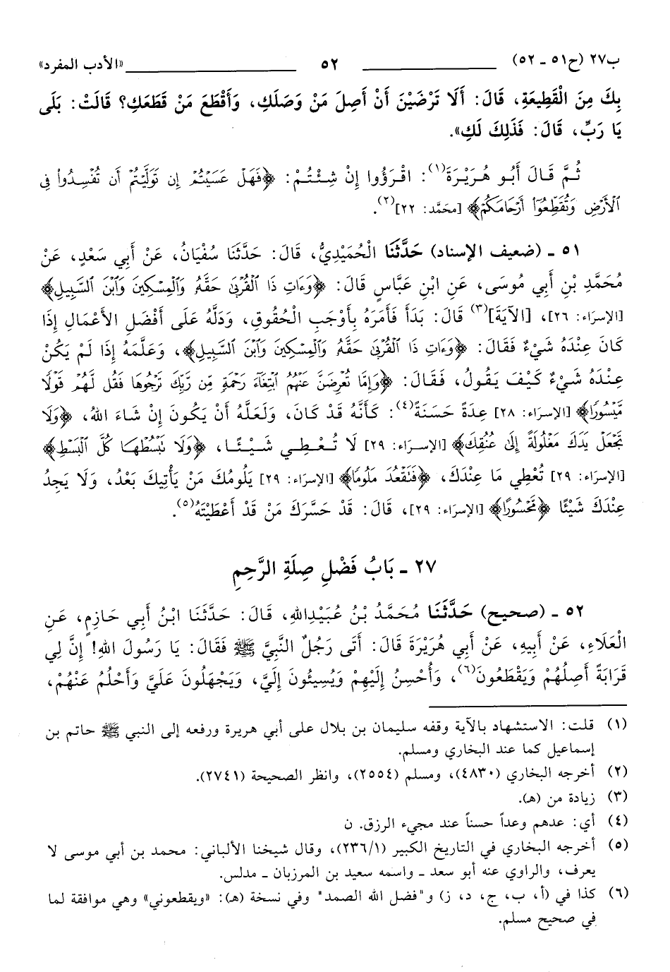 52 - حَدَّثَنَا مُحَمَّدُ بْنُ عُبَيْدِ اللهِ، قَالَ: حَدَّثَنَا ابْنُ أَبِي حَازِمٍ، عَنِ الْعَلاَءِ، عَنْ أَبِيهِ، عَنْ أَبِي هُرَيْرَةَ, قَالَ: أَتَى رَجُلٌ النَّبِيَّ صَلَّى اللهُ عَلَيهِ وَسَلَّمَ فَقَالَ: يَا رَسُولَ اللهِ، إِنَّ لِي قَرَابَةً أَصِلُهُمْ وَيَقْطَعُونَ، وَأُحْسِنُ إِلَيْهِمْ وَيُسِيئُونَ إِلَيَّ، وَيَجْهَلُونَ عَلَيَّ وَأَحْلُمُ عَنْهُمْ، قَالَ: لَئِنْ كَانَ كَمَا تَقُولُ كَأَنَّمَا تُسِفُّهُمُ الْمَلَّ، وَلاَ يَزَالُ مَعَكَ مِنَ اللهِ ظَهِيرٌ عَلَيْهِمْ مَا دُمْتَ عَلَى ذَلِكَ.