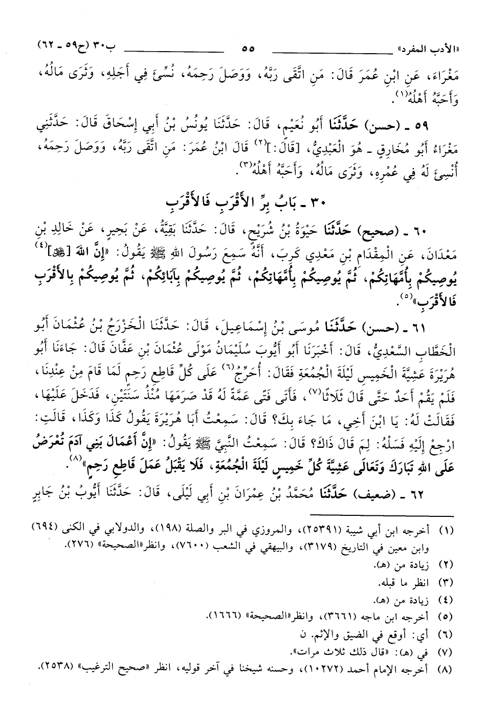61 - حَدَّثَنَا مُوسَى بْنُ إِسْمَاعِيلَ، قَالَ: حَدَّثَنَا الْخَزْرَجُ بْنُ عُثْمَانَ أَبُو الْخَطَّابِ السَّعْدِيُّ، قَالَ: أَخْبَرَنِا أَبُو أَيُّوبَ سُلَيْمَانُ مَوْلَى عُثْمَانَ بْنِ عَفَّانَ قَالَ: جَاءَنَا أَبُو هُرَيْرَةَ, عَشِيَّةَ الْخَمِيسِ لَيْلَةَ الْجُمُعَةِ فَقَالَ: أُحَرِّجُ عَلَى كُلِّ قَاطِعِ رَحِمٍ لَمَا قَامَ مِنْ عِنْدِنَا، فَلَمْ يَقُمْ أَحَدٌ حَتَّى قَالَ ثَلاَثًا، فَأَتَى فَتًى عَمَّةً لَهُ قَدْ صَرَمَهَا مُنْذُ سَنَتَيْنِ، فَدَخَلَ عَلَيْهَا، فَقَالَتْ لَهُ: يَا ابْنَ أَخِي، مَا جَاءَ بِكَ؟ قَالَ: سَمِعْتُ أَبَا هُرَيْرَةَ يَقُولُ كَذَا وَكَذَا، قَالَتِ: ارْجِعْ إِلَيْهِ فَسَلْهُ: لِمَ قَالَ ذَاكَ؟ قَالَ: سَمِعْتُ النَّبِيَّ صَلَّى اللهُ عَلَيهِ وَسَلَّمَ يَقُولُ: إِنَّ أَعْمَالَ بَنِي آدَمَ تُعْرَضُ عَلَى اللهِ تَبَارَكَ وَتَعَالَى عَشِيَّةَ كُلِّ خَمِيسٍ لَيْلَةَ الْجُمُعَةِ، فَلاَ يَقْبَلُ عَمَلَ قَاطِعِ رَحِمٍ.