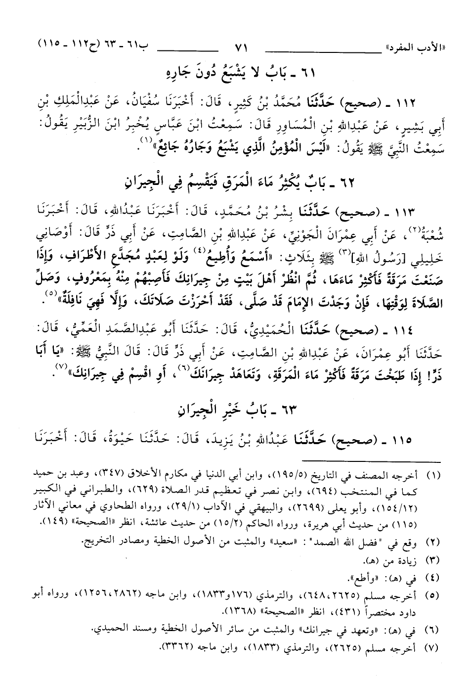 114 - حَدَّثَنَا الْحُمَيْدِيُّ، قَالَ: حَدَّثَنَا أَبُو عَبْدِ الصَّمَدِ الْعَمِّيُّ، قَالَ: حَدَّثَنَا أَبُو عِمْرَانَ، عَنْ عَبْدِ اللهِ بْنِ الصَّامِتِ، عَنْ أَبِي ذَرٍّ, قَالَ: قَالَ النَّبِيُّ صَلَّى اللهُ عَلَيهِ وَسَلَّمَ: يَا أَبَا ذَرٍّ، إِذَا طَبَخْتَ مَرَقَةً فَأَكْثِرْ مَاءَ الْمَرَقَةِ، وَتَعَاهَدْ جِيرَانَكَ، أَوِ اقْسِمْ فِي جِيرَانِكَ.