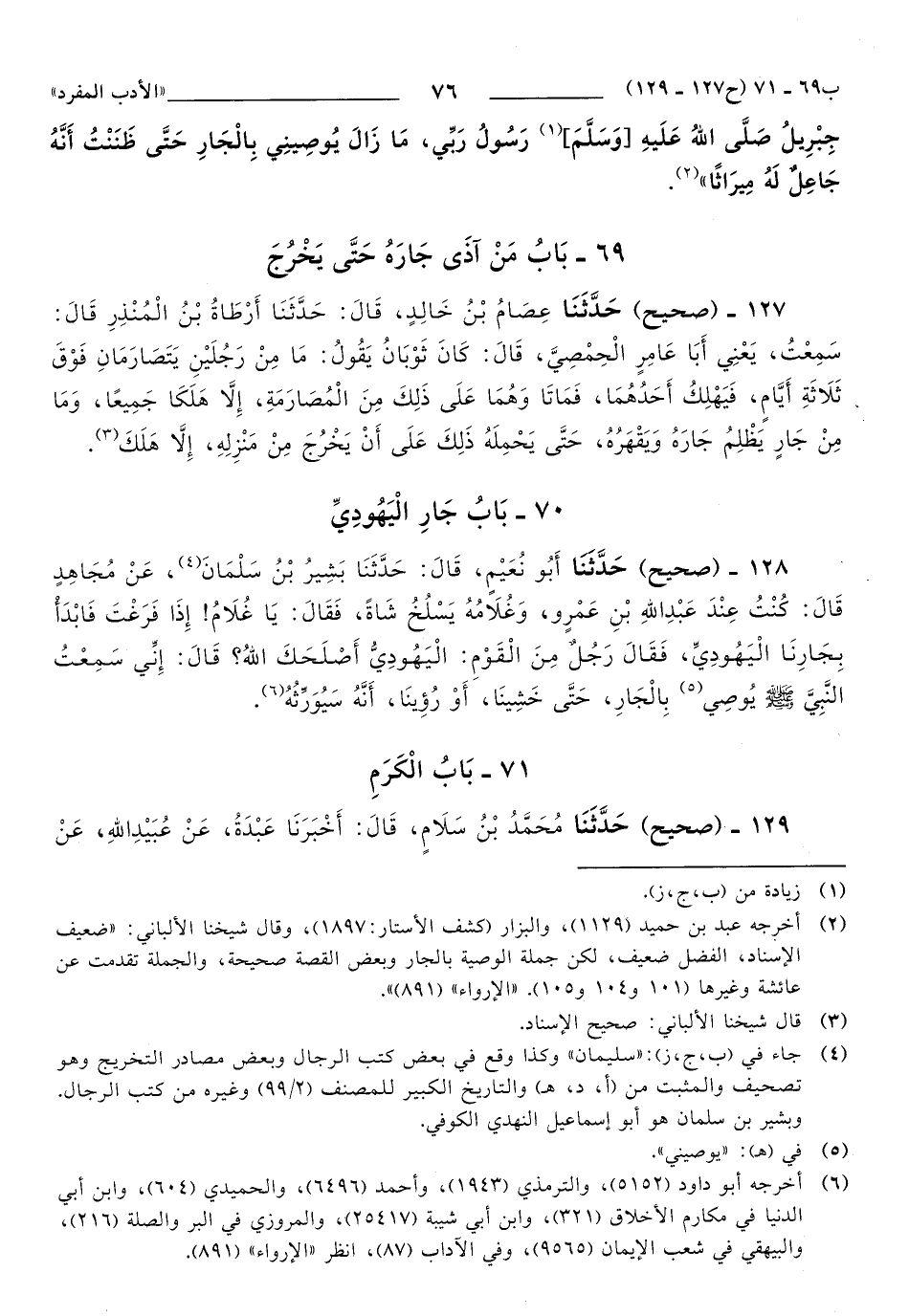 128 - حَدَّثَنَا أَبُو نُعَيْمٍ، قَالَ: حَدَّثَنَا بَشِيرُ بْنُ سَلْمَانَ، عَنْ مُجَاهِدٍ قَالَ: كُنْتُ عِنْدَ عَبْدِ اللهِ بْنِ عَمْرٍو، وَغُلاَمُهُ يَسْلُخُ شَاةً، فَقَالَ: يَا غُلاَمُ، إِذَا فَرَغْتَ فَابْدَأْ بِجَارِنَا الْيَهُودِيِّ، فَقَالَ رَجُلٌ مِنَ الْقَوْمِ: الْيَهُودِيُّ أَصْلَحَكَ اللَّهُ؟ قَالَ: إِنِّي سَمِعْتُ النَّبِيَّ صَلَّى اللهُ عَلَيهِ وَسَلَّمَ يُوصِي بِالْجَارِ، حَتَّى خَشِينَا، أَوْ رُئِينَا، أَنَّهُ سَيُوَرِّثُهُ.