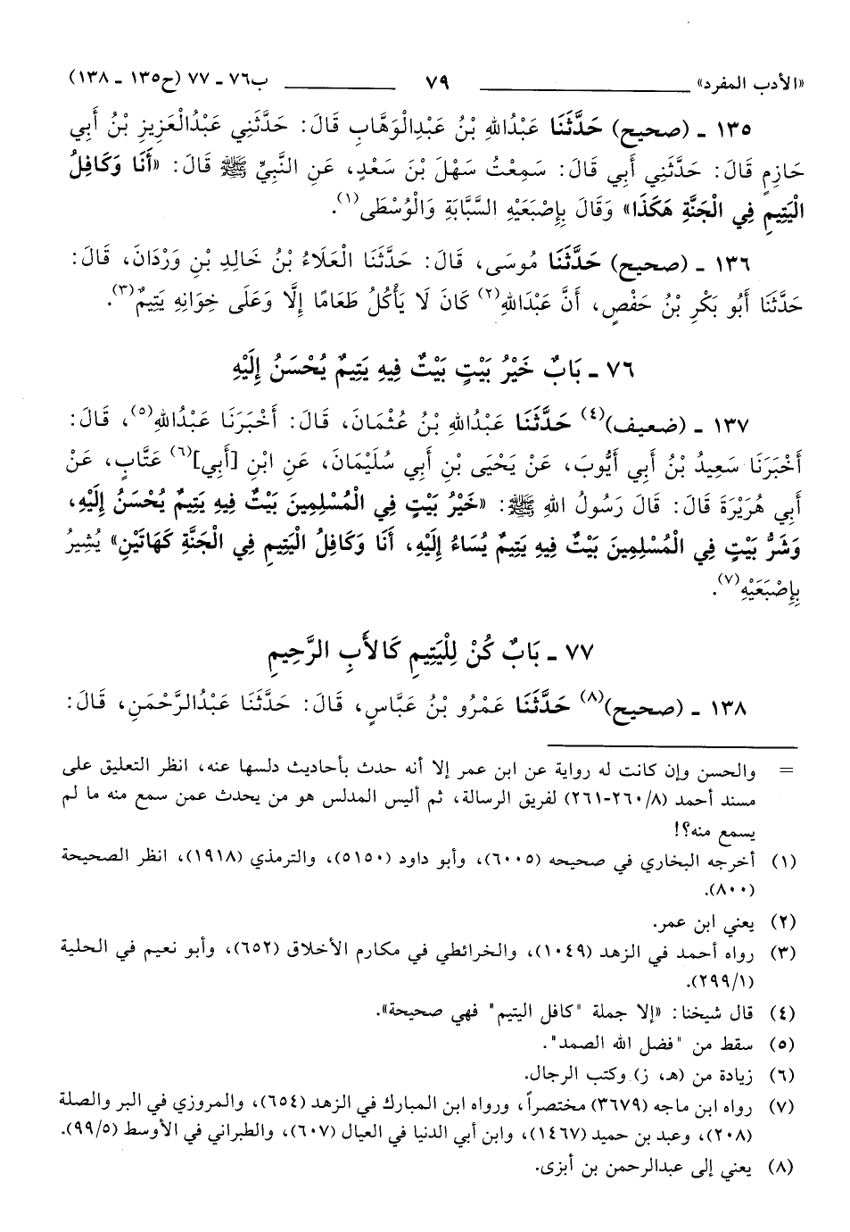 135 - حَدَّثَنَا عَبْدُ اللهِ بْنُ عَبْدِ الْوَهَّابِ, قَالَ: حَدَّثَنِي عَبْدُ الْعَزِيزِ بْنُ أَبِي حَازِمٍ, قَالَ: حَدَّثَنِي أَبِي, قَالَ: سَمِعْتُ سَهْلَ بْنَ سَعْدٍ، عَنِ النَّبِيِّ صَلَّى اللهُ عَلَيهِ وَسَلَّمَ قَالَ: أَنَا وَكَافِلُ الْيَتِيمِ فِي الْجَنَّةِ هَكَذَا، وَقَالَ بِإِصْبَعَيْهِ السَّبَّابَةِ وَالْوُسْطَى.