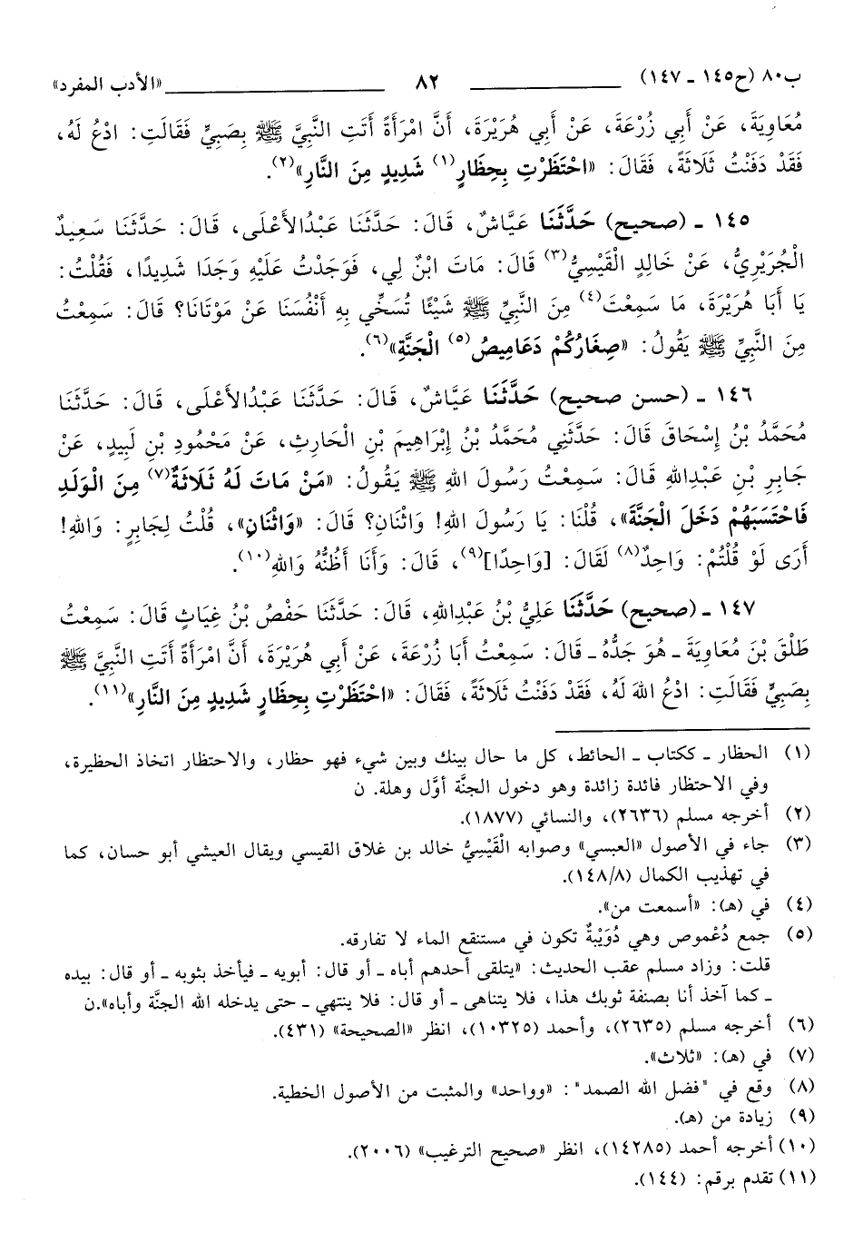 147 - حَدَّثَنَا عَلِيُّ بْنُ عَبْدِ اللهِ، قَالَ: حَدَّثَنَا حَفْصُ بْنُ غِيَاثٍ, قَالَ: سَمِعْتُ طَلْقَ بْنَ مُعَاوِيَةَ، -هُوَ جَدُّهُ-، قَالَ: سَمِعْتُ أَبَا زُرْعَةَ، عَنْ أَبِي هُرَيْرَةَ، أَنَّ امْرَأَةً أَتَتِ النَّبِيَّ صَلَّى اللهُ عَلَيهِ وَسَلَّمَ بِصَبِيٍّ فَقَالَتِ: ادْعُ اللهَ لَهُ، فَقَدْ دَفَنْتُ ثَلاَثَةً، فَقَالَ: احْتَظَرْتِ بِحِظَارٍ شَدِيدٍ مِنَ النَّارِ.