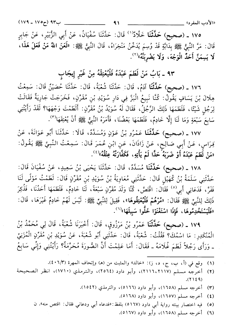 179 - حَدَّثَنَا عَمْرُو بْنُ مَرْزُوقٍ، قَالَ: أَخْبَرَنَا شُعْبَةُ, قَالَ لِي مُحَمَّدُ بْنُ الْمُنْكَدِرِ: مَا اسْمُكَ؟ فقُلْتُ: شُعْبَةُ, قَالَ: حَدَّثَنِي أَبُو شُعْبَةَ، عَنْ سُوَيْدِ بْنِ مُقَرِّنٍ الْمُزَنِيِّ، -وَرَأَى رَجُلاً لَطَمَ غُلاَمَهُ-، فَقَالَ: أَمَا عَلِمْتَ أَنَّ الصُّورَةَ مُحَرَّمَةٌ؟ رَأَيْتُنِي وَإِنِّي سَابِعُ سَبْعَةِ إِخْوَةٍ، عَلَى عَهْدِ رَسُولِ اللهِ صَلَّى اللهُ عَلَيهِ وَسَلَّمَ، مَا لَنَا إِلاَّ خَادِمٌ، فَلَطَمَهُ أَحَدُنَا، فَأَمَرَنَا النَّبِيُّ صَلَّى اللهُ عَلَيهِ وَسَلَّمَ أَنْ نُعْتِقَهُ.