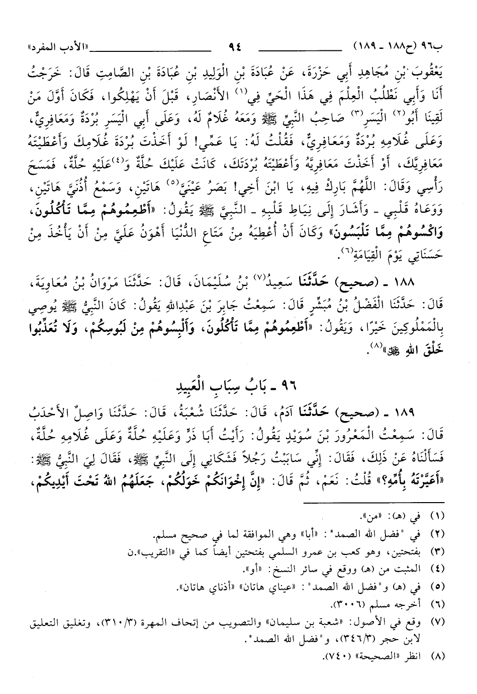 189 - حَدَّثَنَا آدَمُ، قَالَ: حَدَّثَنَا شُعْبَةُ، قَالَ: حَدَّثَنَا وَاصِلٌ الأَحْدَبُ, قَالَ: سَمِعْتُ الْمَعْرُورَ بْنَ سُوَيْدٍ يَقُولُ: رَأَيْتُ أَبَا ذَرٍّ وَعَلَيْهِ حُلَّةٌ وَعَلَى غُلاَمِهِ حُلَّةٌ، فَسَأَلْنَاهُ عَنْ ذَلِكَ، فَقَالَ: إِنِّي سَابَبْتُ رَجُلاً, فَشَكَانِي إِلَى النَّبِيِّ صَلَّى اللهُ عَلَيهِ وَسَلَّمَ، فَقَالَ لِيَ النَّبِيُّ صَلَّى اللهُ عَلَيهِ وَسَلَّمَ: أَعَيَّرْتَهُ بِأُمِّهِ؟ قُلْتُ: نَعَمْ، ثُمَّ قَالَ: إِنَّ إِخْوَانَكُمْ خَوَلُكُمْ، جَعَلَهُمُ اللهُ تَحْتَ أَيْدِيكُمْ، فَمَنْ كَانَ أَخُوهُ تَحْتَ يَدَيْهِ فَلْيُطْعِمْهُ مِمَّا يَأْكُلُ، وَلْيُلْبِسْهُ مِمَّا يَلْبَسُ، وَلاَ تُكَلِّفُوهُمْ مَا يَغْلِبُهُمْ، فَإِنْ كَلَّفْتُمُوهُمْ مَا يَغْلِبُهُمْ فَأَعِينُوهُمْ.