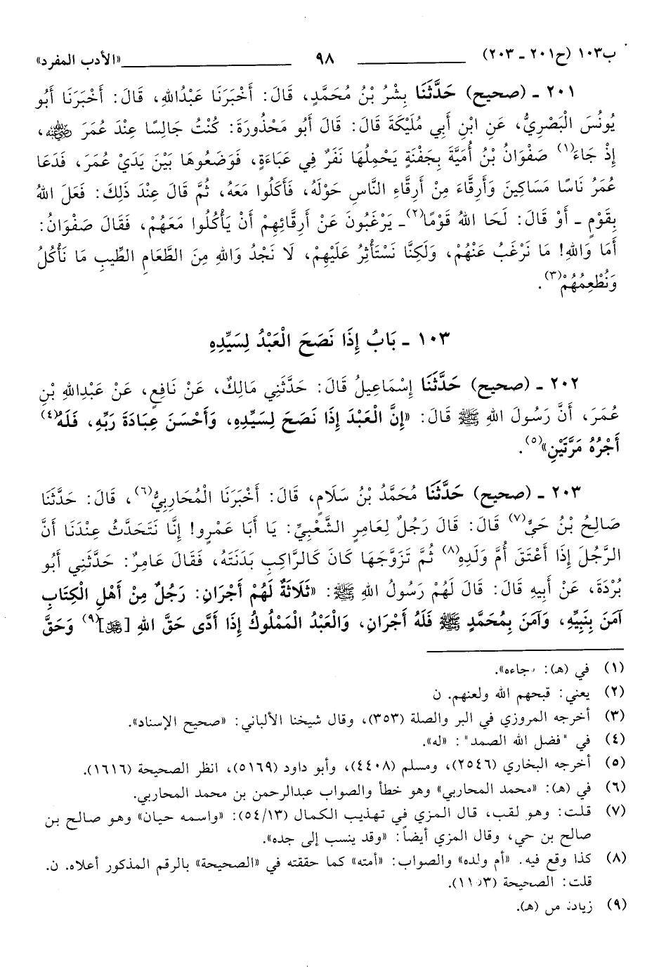 203 - حَدَّثَنَا مُحَمَّدُ بْنُ سَلاَمٍ، قَالَ: أَخْبَرَنَا الْمُحَارِبِيُّ، قَالَ: حَدَّثَنَا صَالِحُ بْنُ حَيٍّ, قَالَ: قَالَ رَجُلٌ لِعَامِرٍ الشَّعْبِيِّ: يَا أَبَا عَمْرٍو، إِنَّا نَتَحَدَّثُ عِنْدَنَا أَنَّ الرَّجُلَ إِذَا أَعْتَقَ أُمَّ وَلَدِهِ ثُمَّ تَزَوَّجَهَا كَانَ كَالرَّاكِبِ بَدَنَتَهُ، فَقَالَ عَامِرٌ: حَدَّثَنِي أَبُو بُرْدَةَ، عَنْ أَبِيهِ, قَالَ: قَالَ لَهُمْ رَسُولُ اللهِ صَلَّى اللهُ عَلَيهِ وَسَلَّمَ: ثَلاَثَةٌ لَهُمْ أَجْرَانِ: رَجُلٌ مِنْ أَهْلِ الْكِتَابِ آمَنَ بِنَبِيِّهِ، وَآمَنَ بِمُحَمَّدٍ صَلَّى اللهُ عَلَيهِ وَسَلَّمَ فَلَهُ أَجْرَانِ، وَالْعَبْدُ الْمَمْلُوكُ إِذَا أَدَّى حَقَّ اللهِ [عز وجل] (1) وَحَقَّ مَوَالِيهِ، وَرَجُلٌ كَانَتْ عِنْدَهُ أَمَةٌ يَطَأَهَا، فَأَدَّبَهَا فَأَحْسَنَ تَأْدِيبَهَا، وَعَلَّمَهَا فَأَحْسَنَ تَعْلِيمَهَا، ثُمَّ أَعْتَقَهَا فَتَزَوَّجَهَا، فَلَهُ أَجْرَانِ, قَالَ عَامِرٌ: أَعْطَيْنَاكَهَا بِغَيْرِ شَيْءٍ، وَقَدْ كَانَ يَرْكَبُ فِيمَا دُونَهَا إِلَى الْمَدِينَةِ.