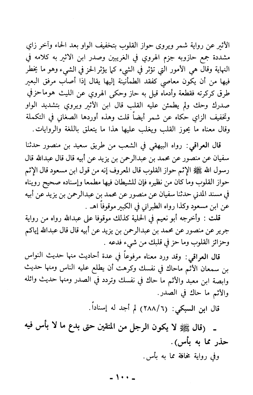قال العراقي: رواه البيهقي في الشعب من طريق سعيد بن منصور حدثنا سفيان عن منصور عن محمد بن عبد الرحمن بن يزيد عن أبيه قال قال عبد الله قال رسول الله - صلى الله عليه وسلم - الإثم حواز القلوب قال المعروف إنه من قول ابن مسعود قال الإثم حواز القلوب وما كان من نظيره فإن للشيطان فيها مطمعاً وإسناده صحيح رويناه في مسند المدني حدثنا سفيان عن منصورعن محمد بن عبد الرحمن بن يزيد عن أبيه عن ابن مسعود وكذا رواه الطبراني في الكبير موقوفاً اهـ.