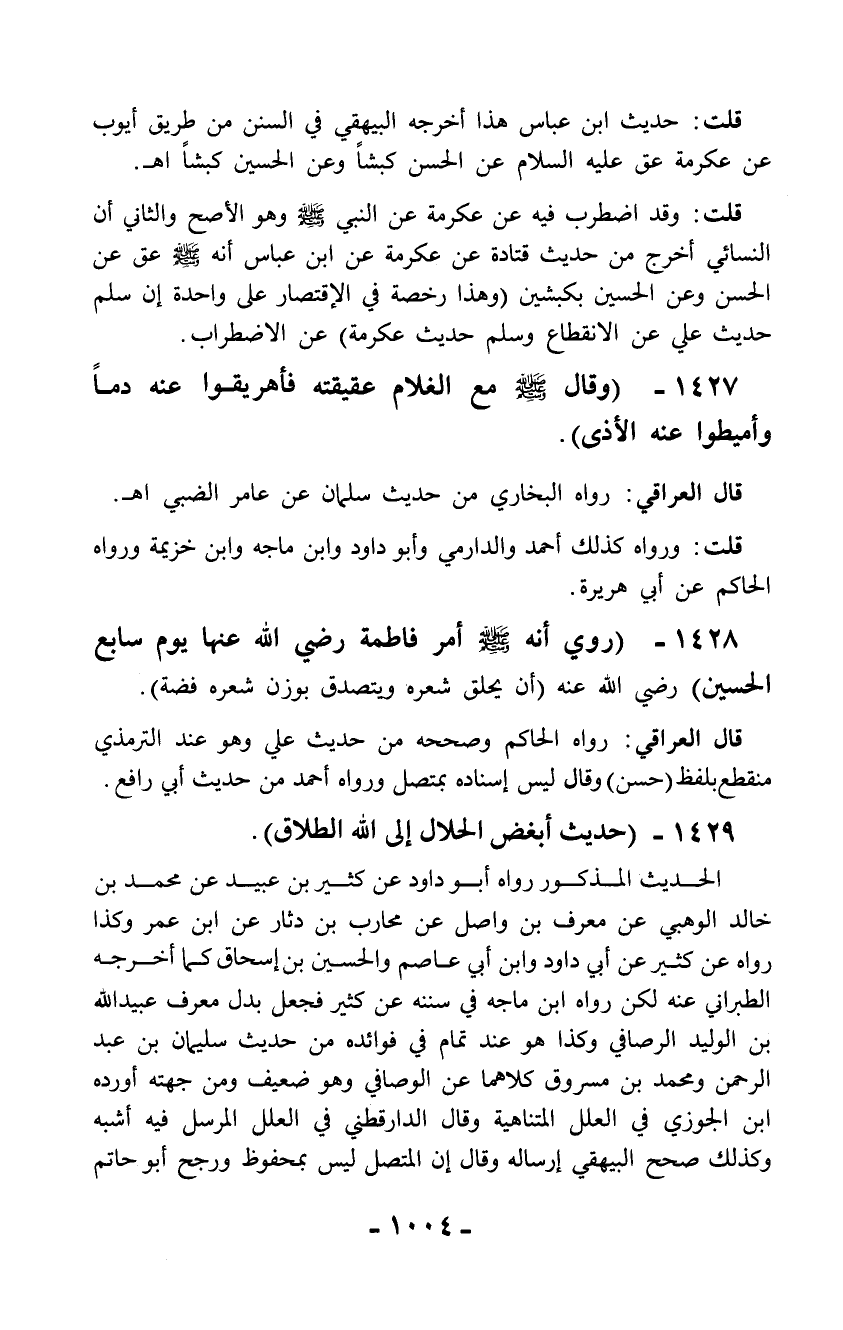 1428 - (روي أنه - صلّى الله عليه وسلم - أمر فاطمة رضي الله عنها يوم سابع الحسين) رضي الله عنه (أن يحلق شعره ويتصدق بوزن شعره فضة).