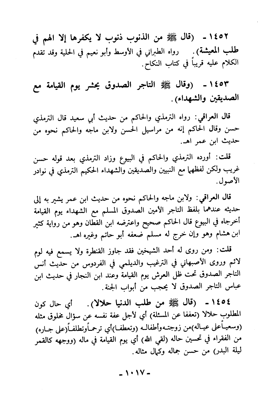 1452 - (قال - صلّى الله عليه وسلم - من الذنوب ذنوب لا يكفرها إلا الهم في طلب المعيشة). رواه الطبراني في الأوسط وأبو نعيم في الحلية وقد تقدم الكلام عليه قريباً في كتاب النكاح.