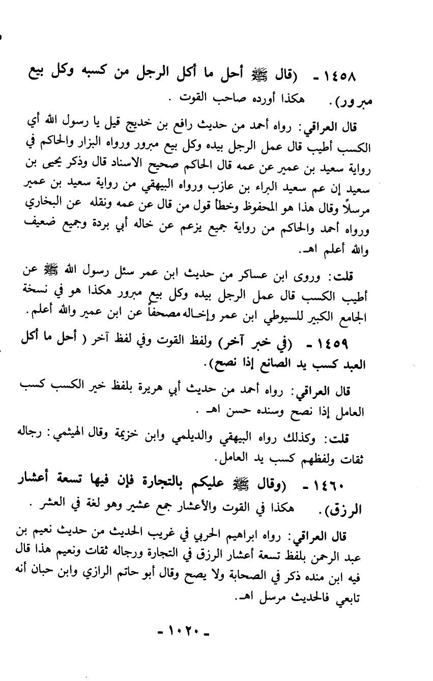 1458 - (قال - صلّى الله عليه وسلم - أحل ما أكل الرجل من كسبه وكل بيع مبرور). هكذا أورده صاحب القوت.