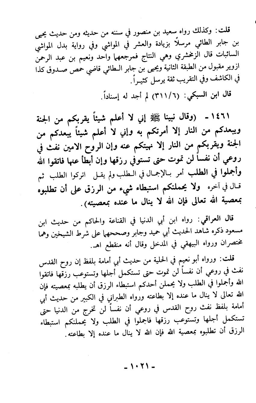 1461 - (وقال نبينا - صلّى الله عليه وسلم - إني لا أعلم شيئاً يقربكم من الجنة ويبعدكم من النار إلا أمرتكم به وإني لا أعلم شيئاً يبعدكم من الجنة ويقربكم من النار إلا نهيتكم عنه وإن الروح الأمين نفث في روعي أن نفساً لن تموت حتى تستوفي رزقها وإن أبطأ عنها فاتقوا الله وأجملوا في الطلب أمر بالإجمال في الطلب ولم يقل اتركوا الطلب ثم قال في آخره ولا يحملنكم استبطاء شيء من الرزق على أن تطلبوه بمعصية الله تعالى فإن الله لا ينال ما عنده بمعصيته).